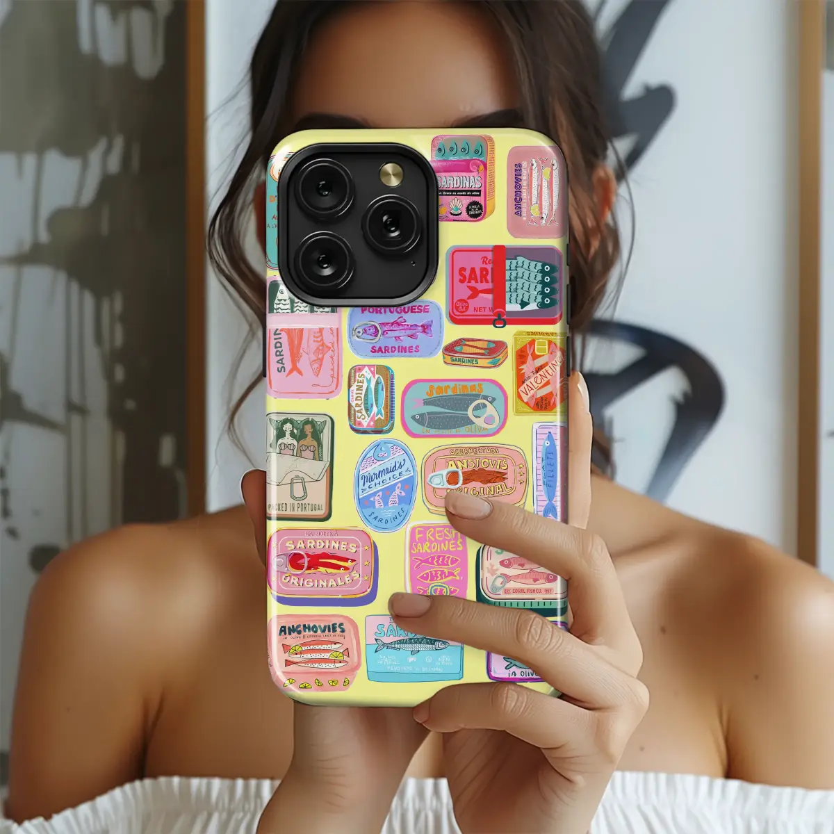 Dive into a vibrant and quirky underwater world with this playful sardine tin collage design. Featuring an eclectic collection of illustrated vintage-style sardine and anchovy cans, this pattern is a celebration of coastal charm and foodie culture. Each tin boasts unique, colorful artwork, from whimsical mermaids to classic Portuguese labels, all set against a cheerful yellow background. It's a fun, artistic statement piece perfect for anyone who loves unique patterns and retro aesthetics.