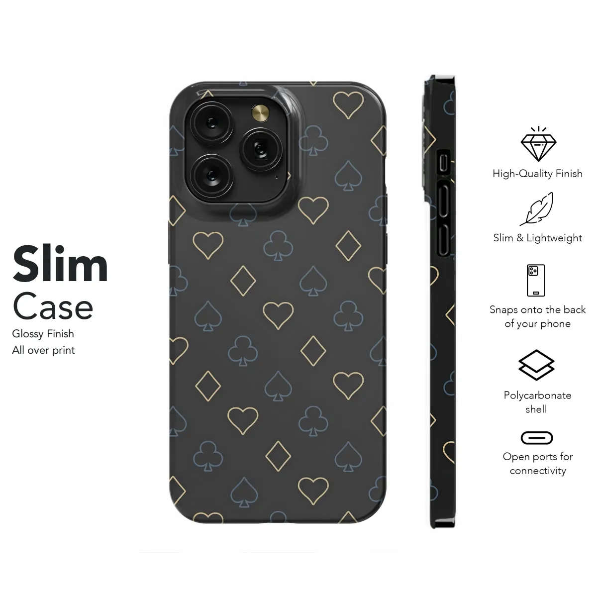 Elevate your style with this sophisticated design featuring a repeating pattern of classic playing card suits. The minimalist aesthetic combines muted gold and blue hues against a sleek black background, creating a subtly luxurious look perfect for the modern individual. This stylish print boasts a timeless appeal, suitable for everyday use or special occasions. The intricate detail ensures a high-quality finish that's both visually captivating and durable. This unique design adds a touch of understated elegance to your personal accessories, reflecting your refined taste and attention to detail. Its versatile design seamlessly blends with various styles, making it a perfect gift for yourself or someone special who appreciates a touch of classic charm. Experience the perfect balance of sophistication and practicality with this exceptional design, showcasing a subtle yet striking pattern that's guaranteed to turn heads. Secure yours today and add a hint of gambling glamour to your everyday life. This print is meticulously crafted to ensure a lasting and vibrant image.