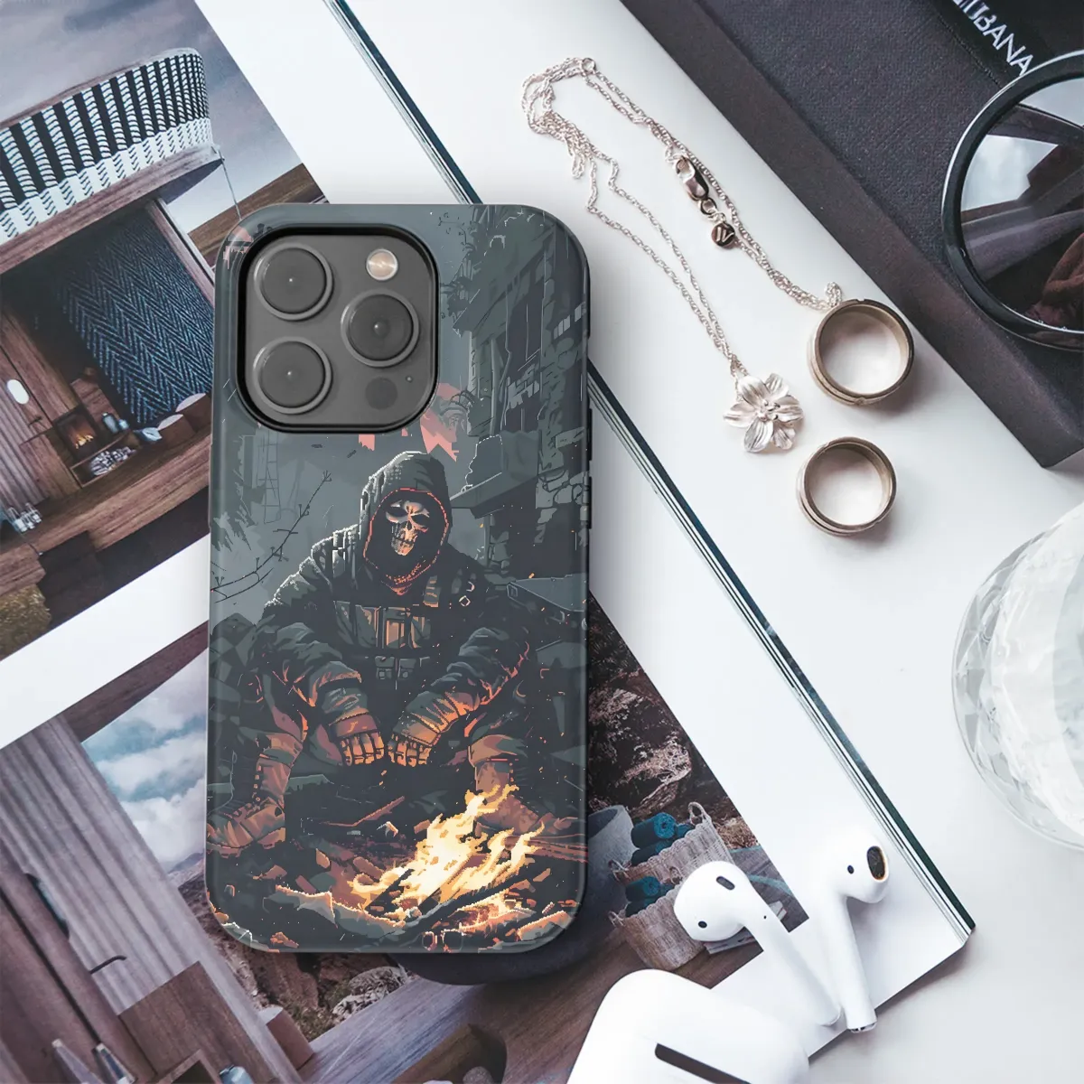 Wrap your device in the gritty beauty of a post-apocalyptic landscape. This striking design features a hooded figure, their skull-like mask illuminated by the flickering flames of a campfire in a desolate, ruined city. The pixel art style lends a unique, nostalgic vibe to this powerful image, perfect for those who appreciate dark fantasy, survival aesthetics, and a touch of the macabre. The detailed artwork captures the harshness of the environment, the lone figure's resilience, and the subtle warmth of the fire, creating a captivating visual narrative. This vibrant print brings a layer of depth and intrigue to your personal technology, transforming it into a statement piece reflecting a bold and individualistic style. The design is printed using high-quality inks, ensuring vibrant colors and long-lasting durability. Show off your appreciation for captivating art and unique designs with this exceptional accessory. This piece is a conversation starter, a visual testament to the enduring spirit of humanity even amidst devastation. It's the perfect gift for fans of video games, dystopian fiction, or anyone seeking a darkly beautiful addition to their personal style.
