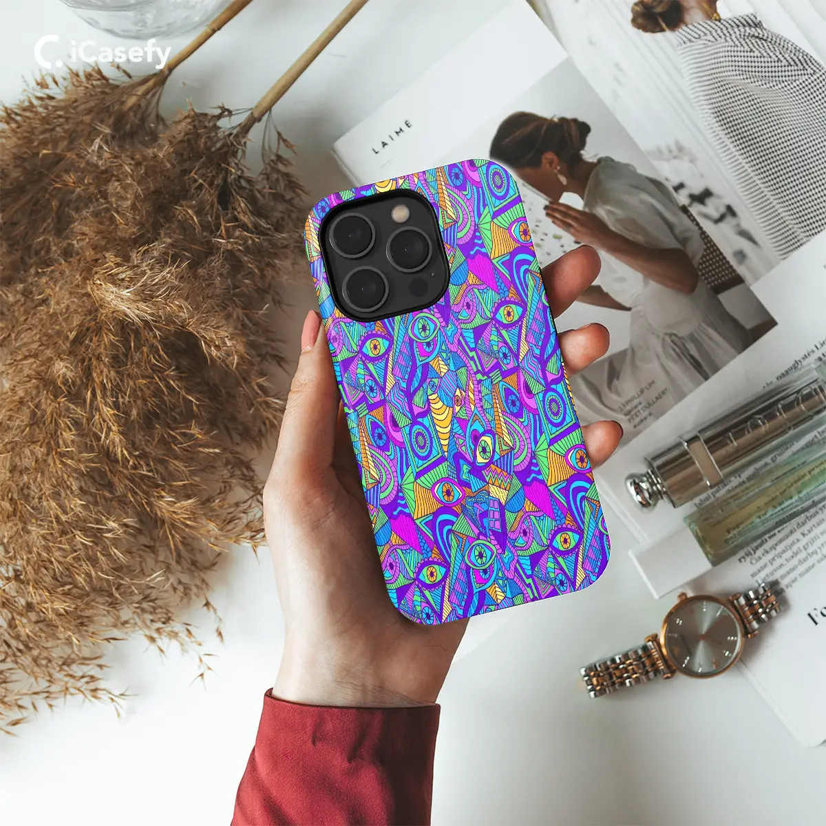 Embrace the vibrant essence of psychedelia with this captivating phone case featuring an explosion of colorful eyes. Its seamless design effortlessly wraps around your phone, creating an air of mystery and intrigue. The swirling hues and intricate patterns will draw attention wherever you go, making your device a true masterpiece. Available for iPhone, Samsung, and Pixel, this case is not just a protective cover but a bold statement of your unique style.