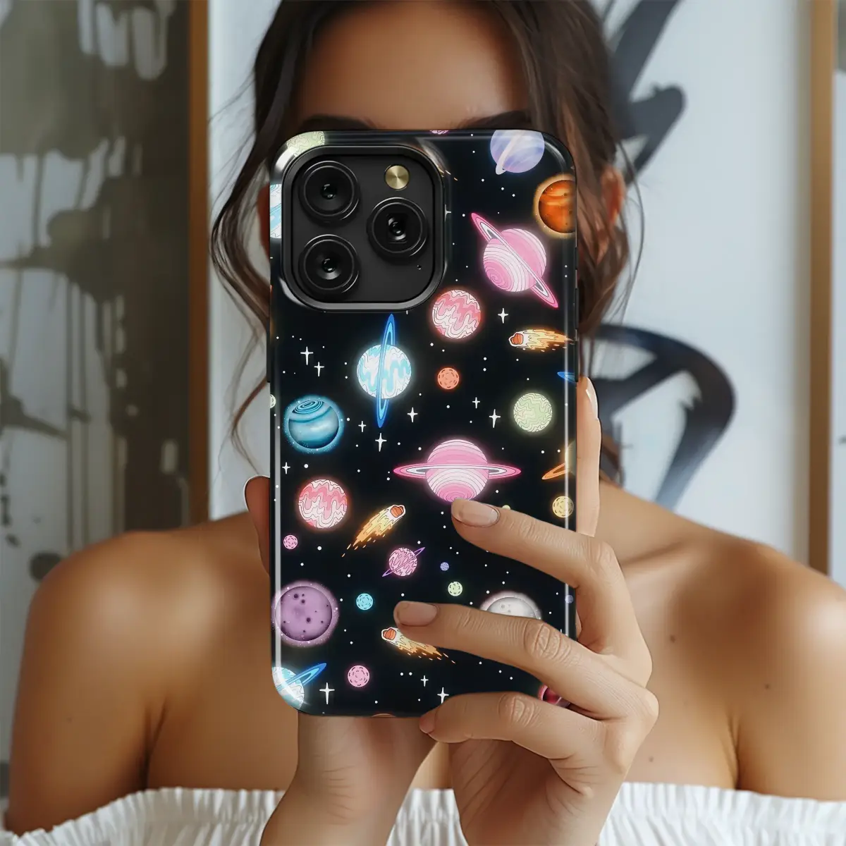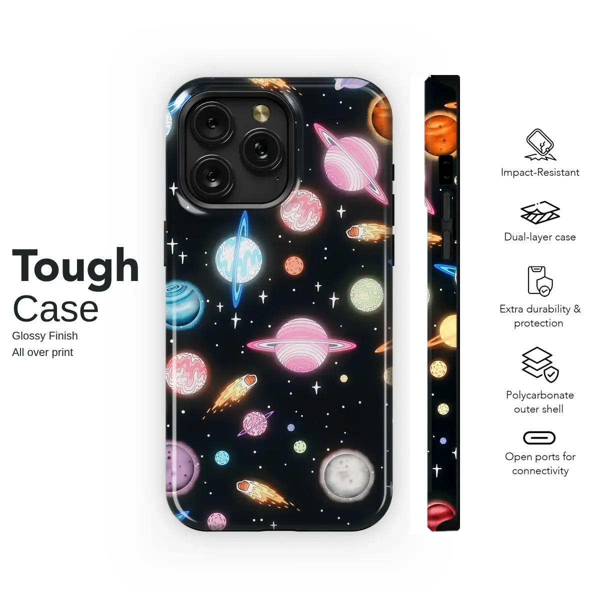 Embark on a cosmic journey with this vibrant celestial design. The artwork features a stunning array of colorful, glowing planets, shooting comets, and twinkling stars set against a deep black space. Each planet boasts a unique, psychedelic pattern and a bright neon outline, creating a playful and mesmerizing galaxy scene perfect for anyone who loves astronomy and space exploration with a whimsical twist.