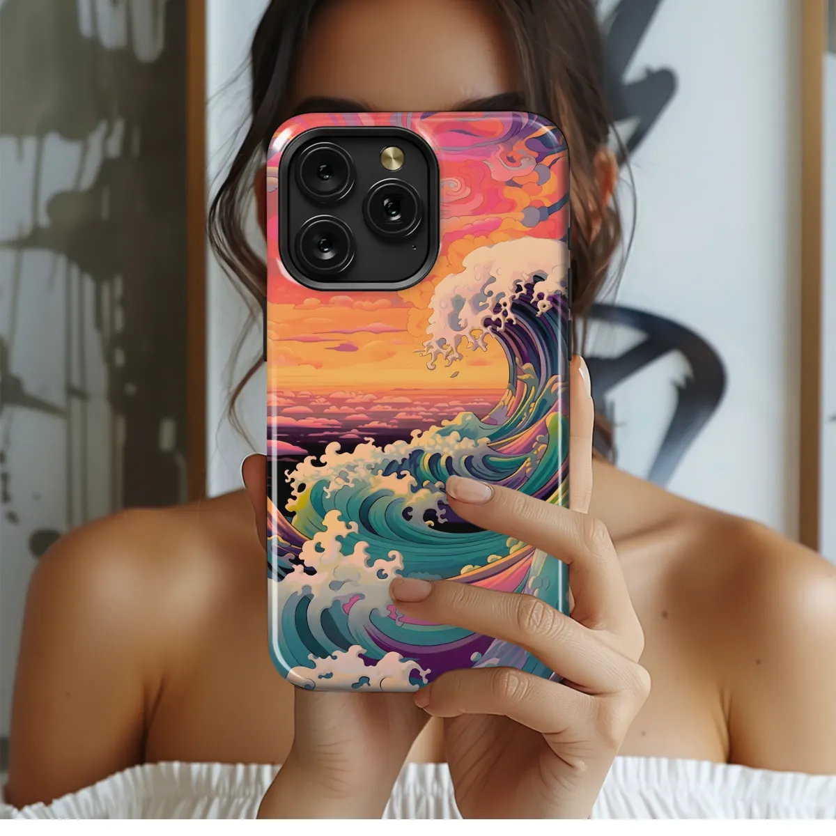 Embrace the vibrant energy of this captivating design, a swirling masterpiece of ocean waves crashing beneath a sunset sky. The rich, saturated colors and stylized wave patterns create a mesmerizing visual experience, perfect for adding a touch of artistic flair to your everyday life. This print showcases a unique blend of traditional Japanese art influences with a modern, psychedelic twist, resulting in a piece that's both timeless and contemporary. Its dynamic composition and bold color palette are guaranteed to turn heads and spark conversation. The detailed rendering of the waves and the fiery sunset backdrop evokes a feeling of powerful serenity, making it a striking and memorable addition to your personal style. This high-quality print is designed to last, offering a vivid and long-lasting image that will withstand daily use. Transform your accessory into a canvas of artistic expression with this one-of-a-kind design; add a touch of wave power to your look. Its versatility makes it a superb gift for art lovers, ocean enthusiasts, or anyone who appreciates bold, unique style. Shop now and bring the beauty of the ocean sunset to your world.