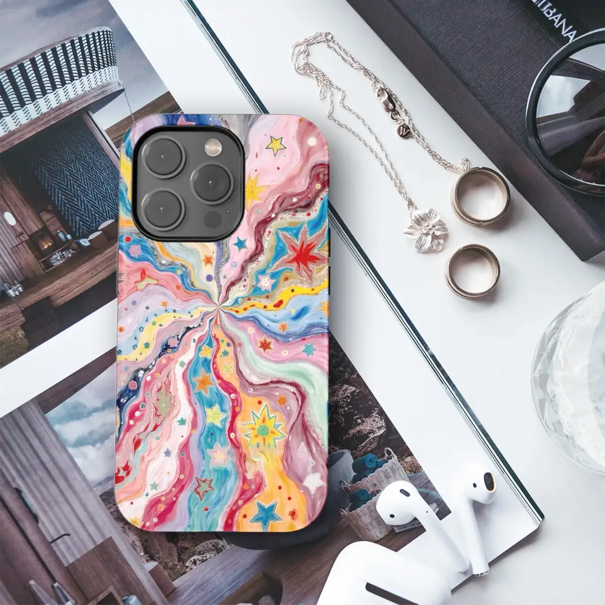 Immerse yourself in a cosmic explosion with this vibrant psychedelic design. Featuring a whimsical array of swirling, multi-colored waves and scattered stars, the artwork radiates from a central point, creating a sense of dynamic energy and movement. This groovy, celestial pattern blends a retro vibe with modern abstract art, resulting in a truly unique and eye-catching piece.
