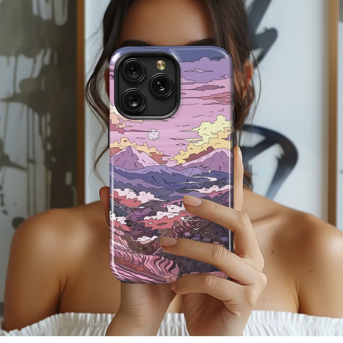 Escape into the tranquility of nature with this phone case adorned with a serene mountain landscape in hues of purple. Its calming design will transport you to a peaceful retreat, while the durable construction protects your device from everyday wear and tear. Whether you're scaling peaks or navigating the digital world, this case will be your loyal companion, reminding you of the serenity that awaits.