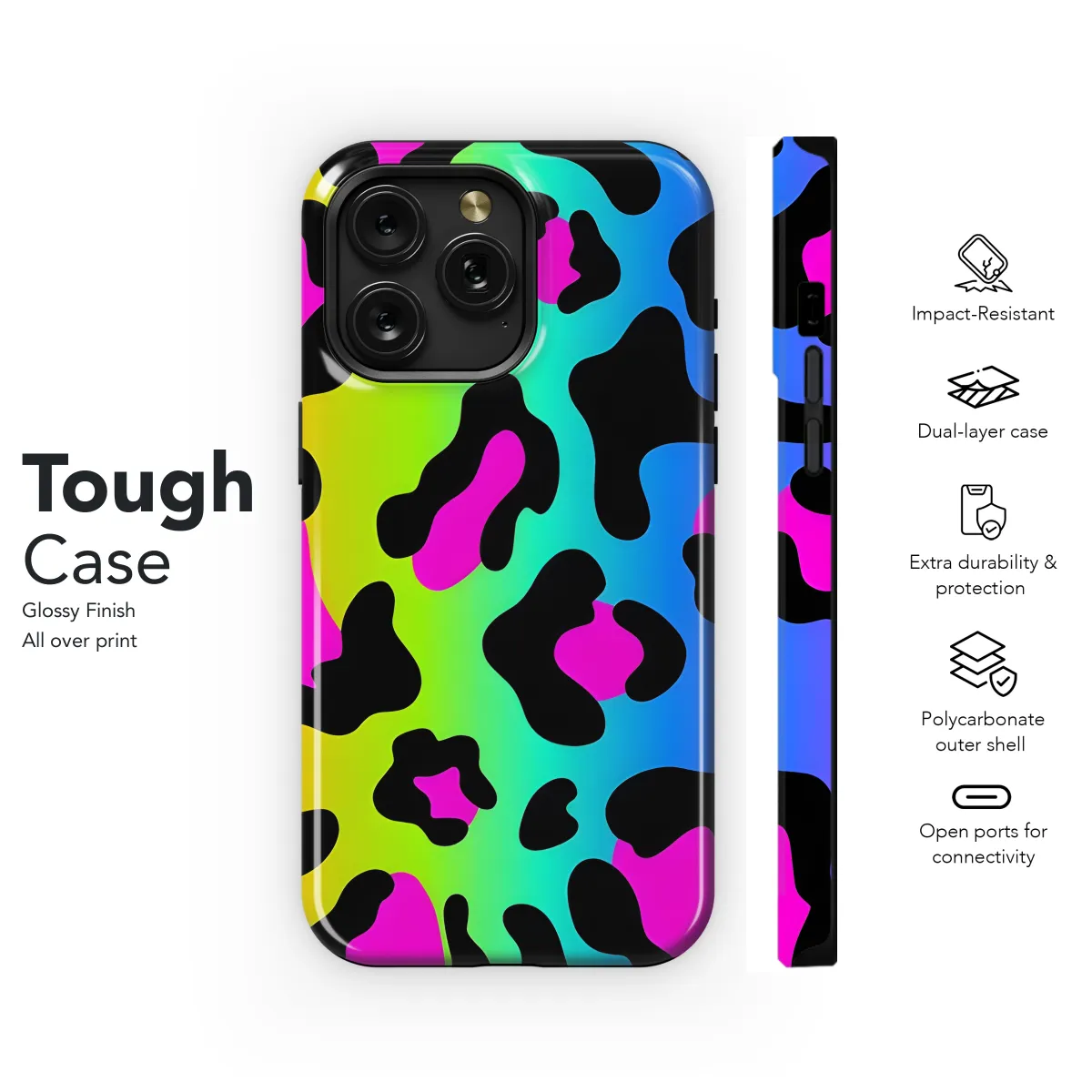 Indulge in the vibrant fusion of a rainbow and leopard print adorned on your phone case. This captivating cover not only protects your device but also adds a touch of wild yet whimsical style. With its sleek design, effortless fit, and eye-catching pattern, this case transforms your phone into a statement piece that demands attention. Embrace the spirit of the animal kingdom while celebrating a kaleidoscope of colors with our Rainbow Leopard Phone Case, available for a range of iPhone, Samsung, and Pixel models.