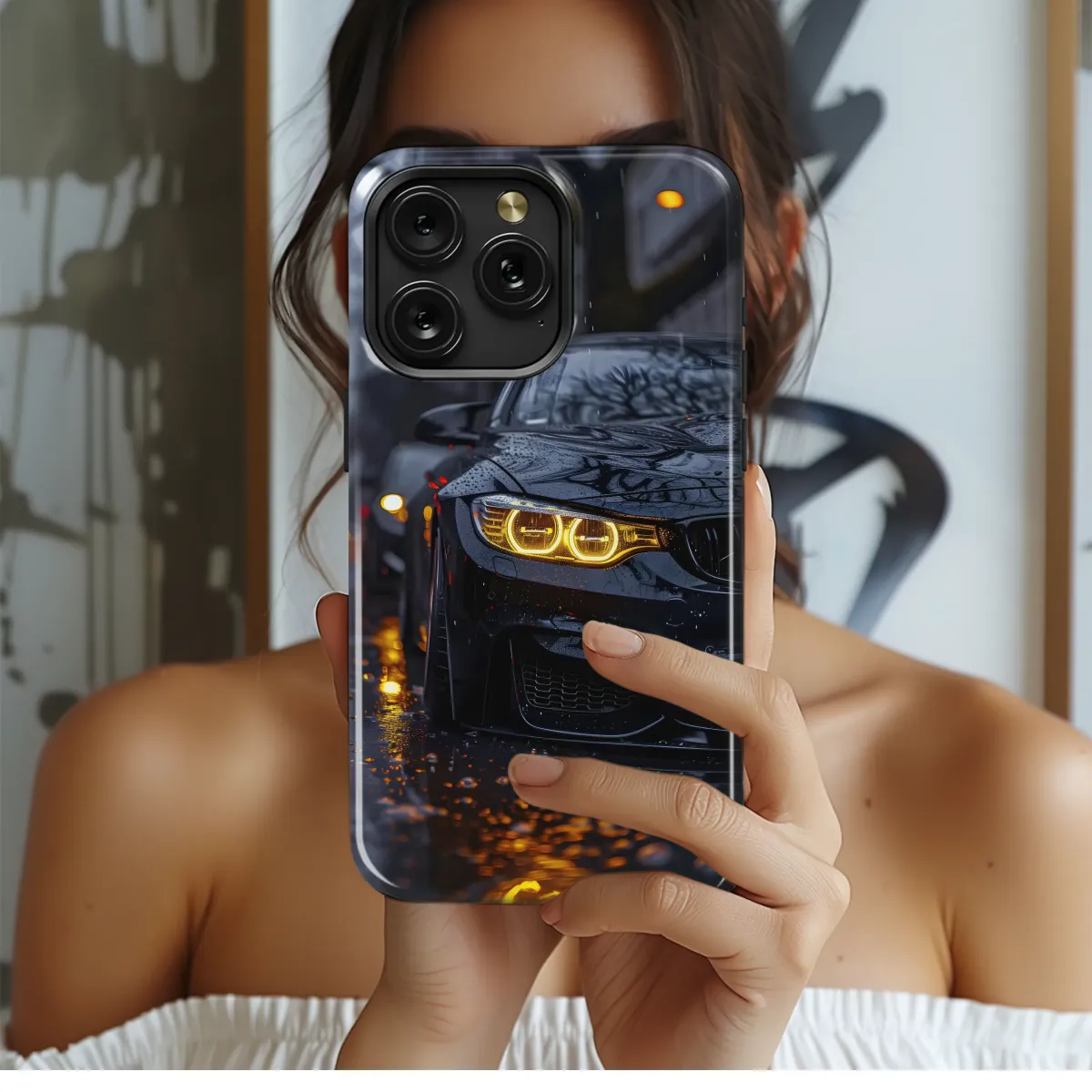 Elevate your style with this captivating design, featuring a sleek, dark vehicle gleaming under the city lights. Rain-kissed and radiant, the image captures the dynamic energy of urban nights. This vibrant print is perfect for showcasing your appreciation for powerful aesthetics and sophisticated design. The intense headlights and reflective surfaces create a mesmerizing visual effect, guaranteed to turn heads. Transform your everyday accessory into a statement piece, reflecting your unique personality and love for cutting-edge style. This high-resolution image ensures exceptional clarity and vibrant colors, promising a long-lasting, stunning print. Express your individuality with this eye-catching graphic that beautifully blends power and elegance; a perfect blend of urban sophistication and modern design. The detailed image ensures a high-quality finish, ready to make a bold statement. This design is a must-have for those seeking a unique and stylish accessory.