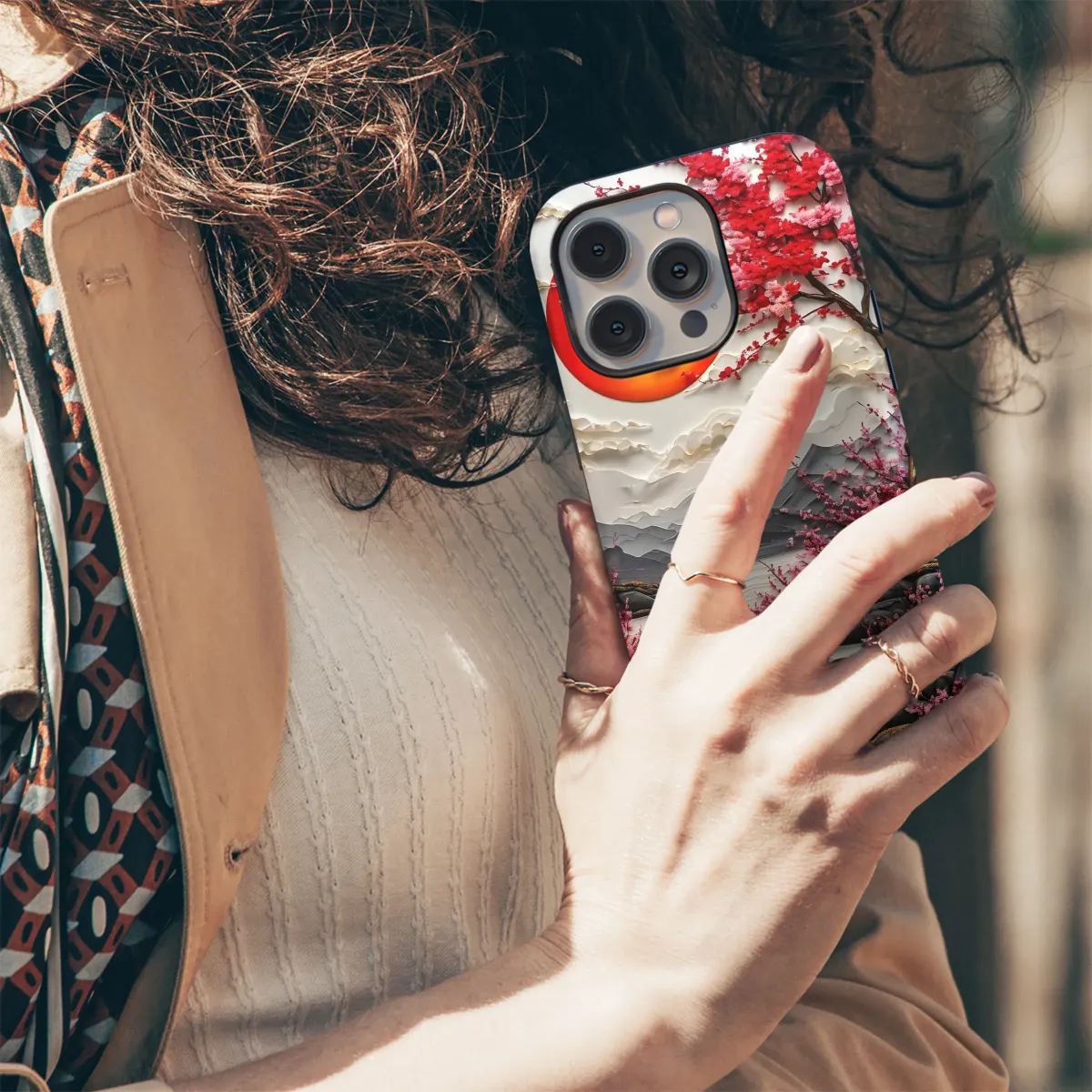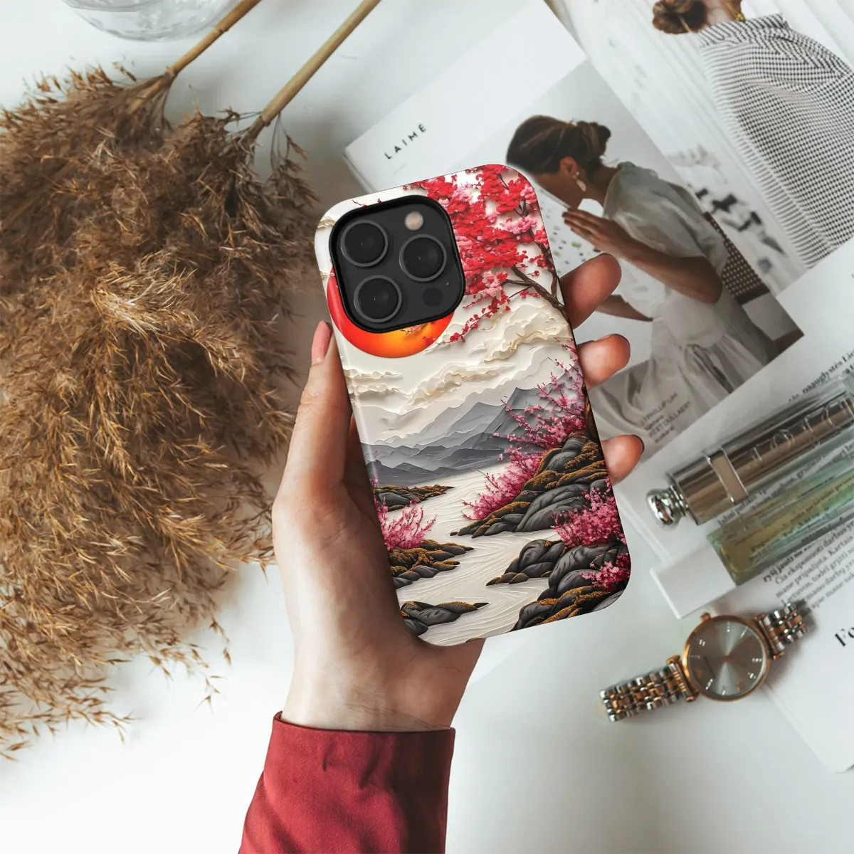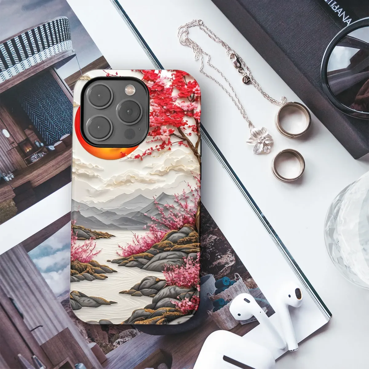 Elevate your style with this breathtaking design, featuring a vibrant crimson tree in full bloom against the backdrop of a fiery sunset. Intricate paper-cut details bring the serene landscape to life, showcasing a tranquil river winding through grey mountains, adorned with blossoming branches. The artistic composition evokes a sense of peace and tranquility, making it a perfect statement piece. This high-resolution image is printed with vibrant, long-lasting inks, ensuring your design remains stunning for years to come. The image boasts exceptional detail, capturing the delicate texture of the flowers and the smooth curves of the river. Add a touch of artistic sophistication to your everyday life with this unique and captivating design; a conversation starter that perfectly complements any personal aesthetic. This gorgeous design will transform your accessory into a wearable work of art, a testament to your appreciation for beauty and originality. Perfect for expressing your individual style with a touch of serene elegance. This piece is a true reflection of artistic mastery, transforming a simple object into a stunning statement of personal style.