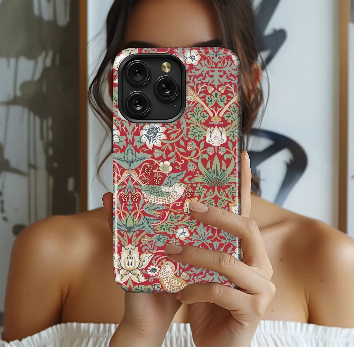 Adorn your device with this exquisite, vibrant design inspired by classic botanical artistry. This captivating print features a rich tapestry of intricately detailed birds, flourishing blossoms, and lush foliage, all rendered in a striking palette of reds, greens, and creams. The timeless elegance of this artwork will transform your personal accessory into a statement piece, reflecting your refined taste and appreciation for beautiful design. Perfect for adding a touch of vintage charm and sophisticated style to your everyday life, this meticulously crafted pattern will bring a burst of color and elegance wherever you go. The high-quality print ensures vibrant, long-lasting color and exceptional detail, preserving the beauty of this stunning artwork for years to come. Make a stylish statement with this uniquely artistic and eye-catching accessory. This design is a perfect blend of nature's beauty and artistic expression, guaranteed to turn heads and spark conversations. Protect your device in style with this gorgeous and durable printed accessory. It's the perfect gift for the art lover or anyone who appreciates fine craftsmanship and timeless designs.