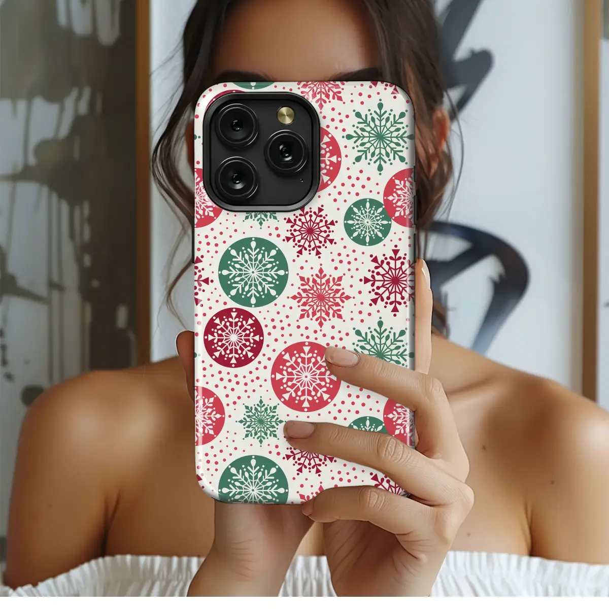 Embrace the holiday spirit with this festive design. Featuring a delightful pattern of red and green snowflakes against a clean white background, this design captures the magic of winter. The intricate snowflake shapes, some set within bold circles, are complemented by a playful scattering of red dots, creating a cheerful and classic Christmas look.