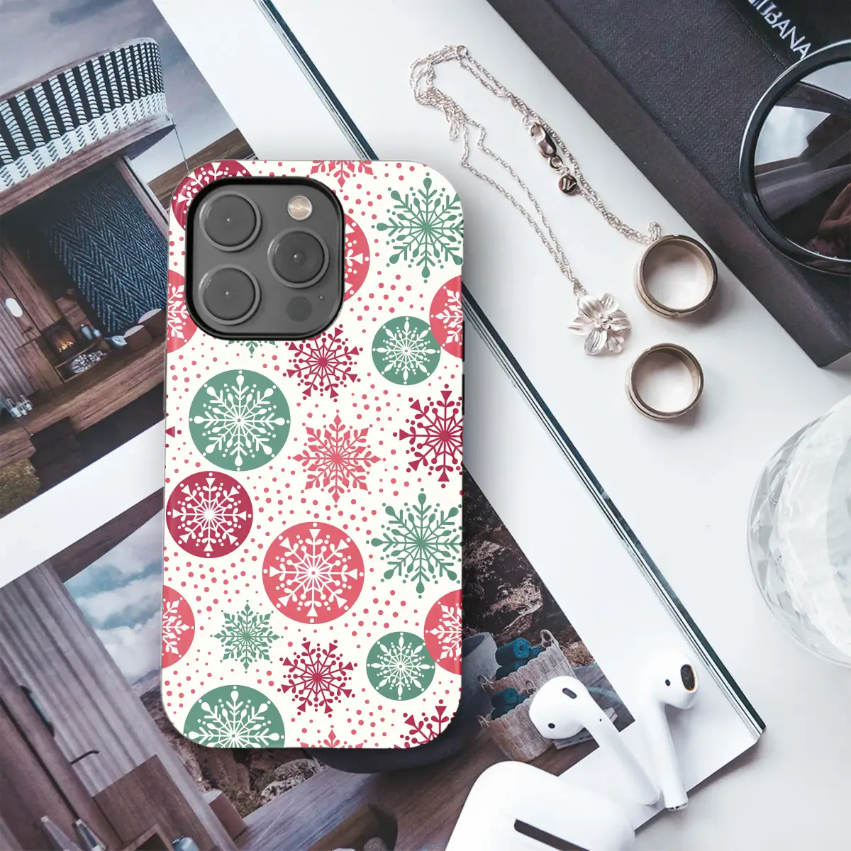 Embrace the holiday spirit with this festive design. Featuring a delightful pattern of red and green snowflakes against a clean white background, this design captures the magic of winter. The intricate snowflake shapes, some set within bold circles, are complemented by a playful scattering of red dots, creating a cheerful and classic Christmas look.
