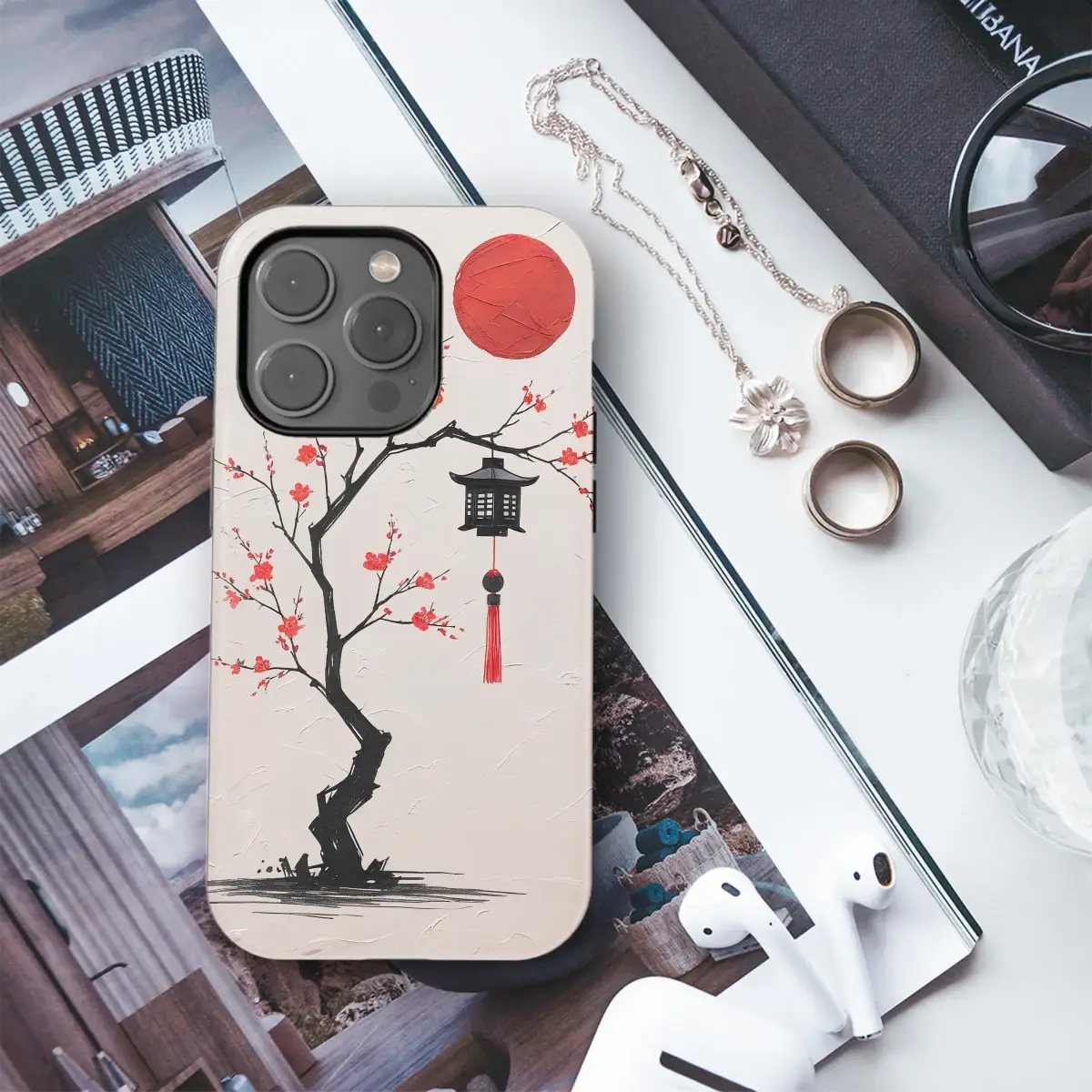 Embrace a moment of pure tranquility and carry a piece of serene art with you every single day. This stunning Japanese-inspired design captures the quiet beauty of a moonlit garden, bringing a sense of calm to your daily hustle. A bold, sumi-e style cherry blossom tree, its ink-black branches twisting with elegant energy, reaches towards a powerful, textured red sun. Each delicate crimson blossom is a tiny burst of passion against the tranquil, textured cream backdrop, creating a breathtaking contrast. A traditional lantern with a silken red tassel hangs peacefully from a branch, offering a silent invitation to pause and reflect. This isn't just a pattern; it's a portable piece of Zen, a story told in red, black, and white. Adorn your most essential tech accessory with this minimalist masterpiece and showcase your love for aesthetic, Asian-inspired art. Perfect as a thoughtful gift for her or a unique treat for yourself, this Red Sun Sakura design wraps your device in timeless elegance, making your everyday style truly unforgettable. It's more than protection; it's a personal statement of grace and beauty.