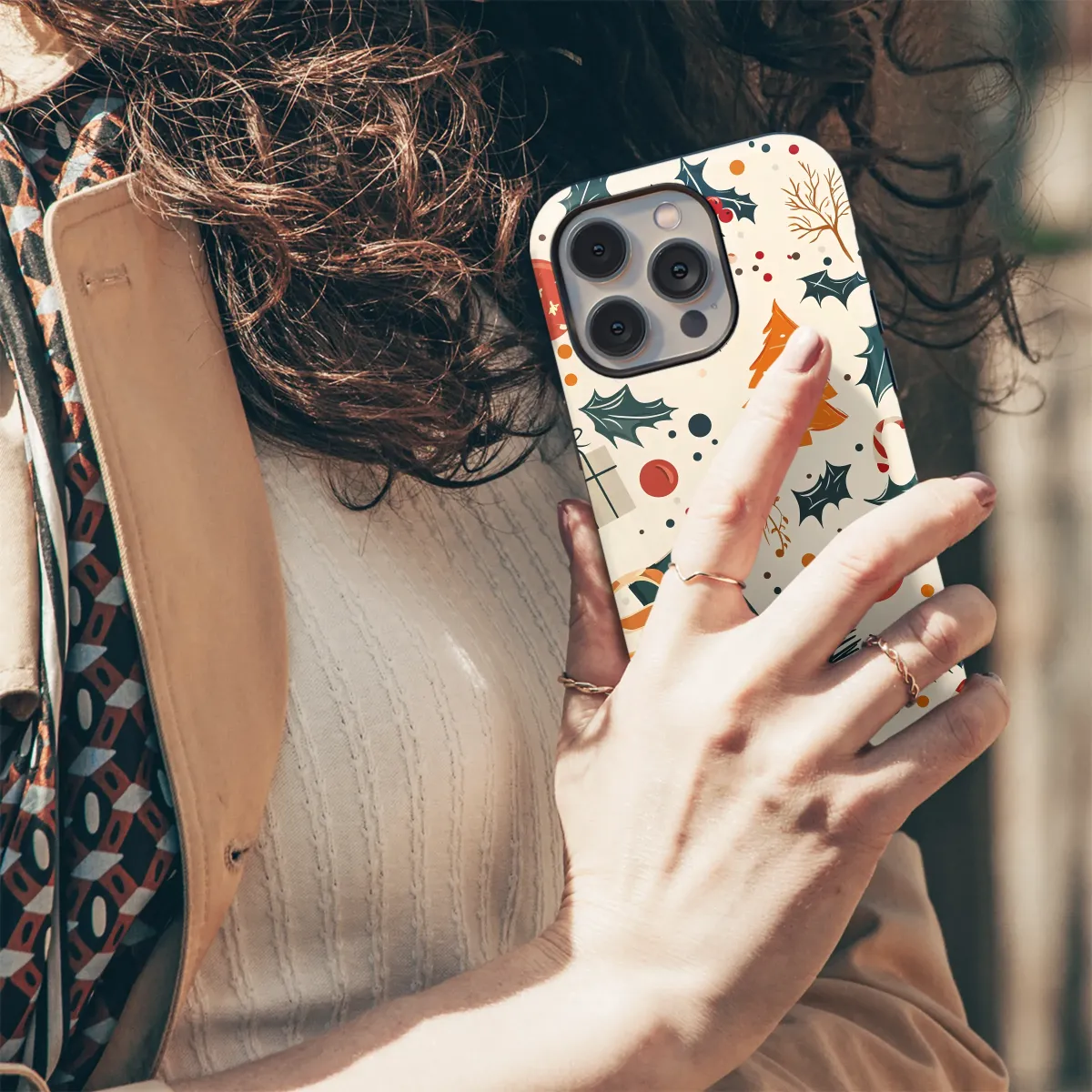Wrap your everyday moments in the warm glow of holiday nostalgia with this enchanting artwork. A delightful pattern unfolds across a creamy, dreamy backdrop, capturing the timeless magic of a classic Christmas. Sprigs of rich green holly, dotted with bright red berries, dance alongside fragrant pine branches and whimsical candy canes. Cheerful orange Christmas trees and vintage-inspired red baubles add a pop of retro charm, while beautifully wrapped presents tied with festive ribbons hint at wonderful surprises. This cozy winter aesthetic celebrates all things merry and bright, making it a perfect way to carry a piece of holiday cheer with you. It’s an ideal design for a unique stocking stuffer or a thoughtful secret santa gift, evoking the heartwarming feeling of yuletide joy. Let this charming illustration be a constant reminder of cozy nights by the fire, festive gatherings, and the simple, sparkling magic that makes this season so special. It’s not just a design; it's a sprinkle of Christmas spirit.