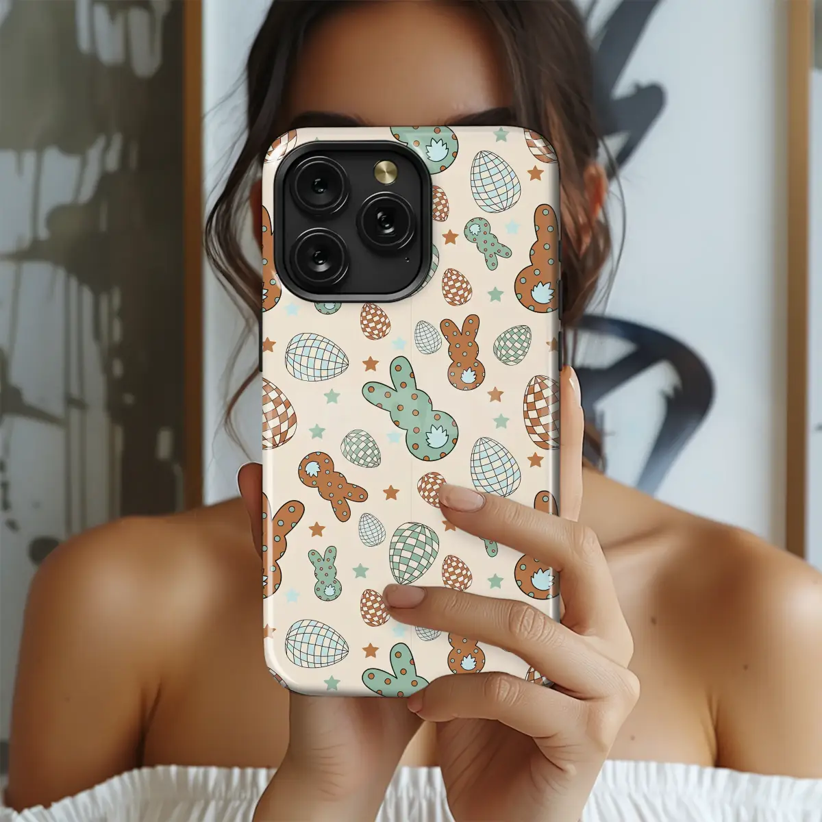 Celebrate the season with this charming and groovy Easter pattern. Featuring whimsical polka-dot and checkered bunnies alongside decorated eggs and tiny stars, this design captures a playful, retro vibe. The vintage-inspired color palette of muted brown, sage green, and soft blue on a cream background adds a warm, nostalgic touch to your everyday style.