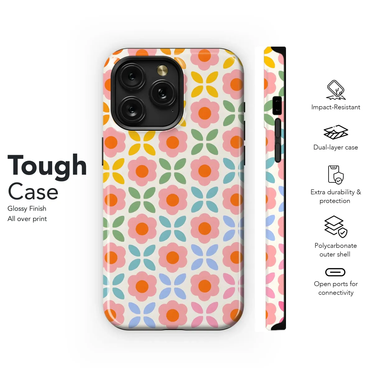 Bring a touch of retro charm to your everyday tech with this vibrant floral pattern. This eye-catching design features a repeating motif of cheerful pink blooms with bright orange centers, interspersed with stylized four-leaf accents in a delightful rainbow of colors - sunny yellow, zesty orange, fresh green, cool turquoise, and soft blue. It's a playful and uplifting aesthetic, perfect for adding a pop of personality to your gadgets. Ideal for those who love mid-century modern style, botanical prints, and colorful designs. This pattern is a great way to express your individuality and protect your device with a unique and stylish look. Let this cheerful floral design brighten your day, every time you reach for your devices. Get yours today and add a touch of retro flair to your mobile essentials!