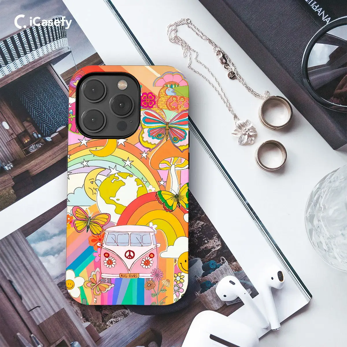 Embrace the vibrant spirit of the 70s with this retro-inspired phone case featuring a groovy hippie floral rainbow design. With its psychedelic colors and trippy patterns, this accessory captures the free-spirited energy of the era. Carry a touch of retro nostalgia with you wherever you go, letting your device become a statement piece that celebrates the timeless appeal of hippie culture and groovy vibes.