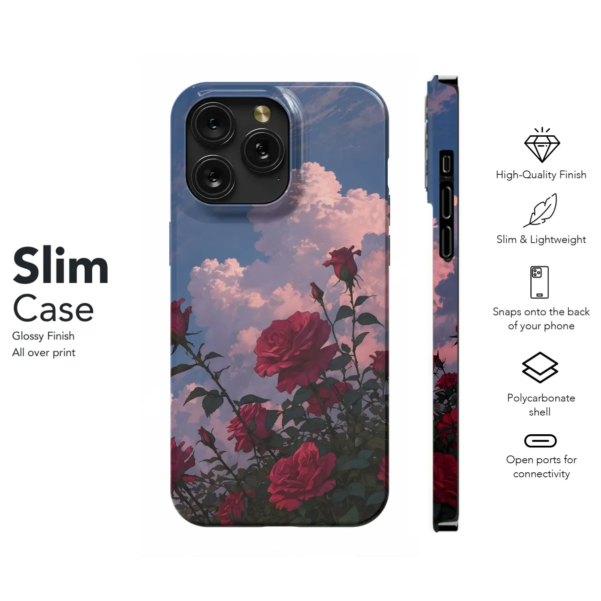 Elevate your everyday carry with this enchanting floral design. Imagine a twilight garden captured on a sleek accessory, featuring vibrant red roses reaching towards a dreamy sky. Billowing, blush-toned clouds drift beneath a luminous crescent moon, creating a captivating scene of serenity and beauty. The design is perfect for those who love nature-inspired aesthetics, romantic themes, and a touch of fantasy. This art print will make your device stand out with unique artwork, protecting it from daily wear and tear while showcasing your individual style. Perfect for rose lovers, moon gazers, and anyone seeking a touch of ethereal charm. This botanical garden themed artwork will be an ideal gift for her. Let this dreamy illustration be a daily reminder of beauty and tranquility. Discover a captivating piece with a touch of aesthetic, celestial charm, and floral elegance.