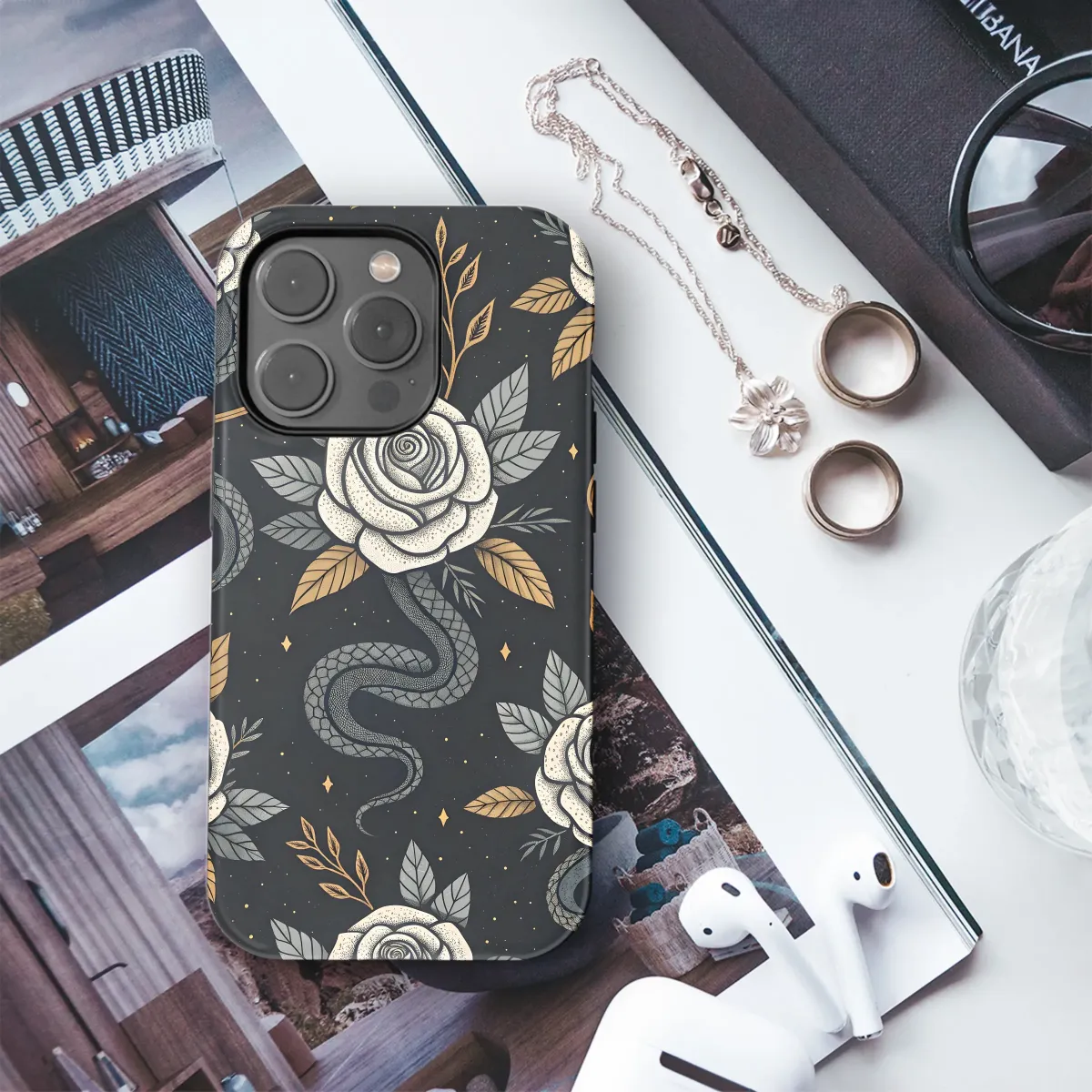Elevate your style with this captivating design featuring intricately detailed roses and elegant snakes intertwined against a midnight-black backdrop. Gold accents add a touch of luxury, creating a mesmerizing pattern perfect for expressing your unique personality. This meticulously crafted artwork boasts a vintage aesthetic with a modern twist, showcasing a striking contrast between the delicate roses and the sinuous snakes. The detailed stippling and rich color palette combine to produce a high-quality, eye-catching print that's sure to be a conversation starter. This sophisticated design transcends trends, offering timeless appeal and a touch of mystique. Its rich symbolism speaks to both strength and beauty, making it a perfect statement piece for those who appreciate artistry and individuality. Order yours today and transform your accessory into a work of art. This design is printed using vibrant, long-lasting inks for exceptional quality and durability.