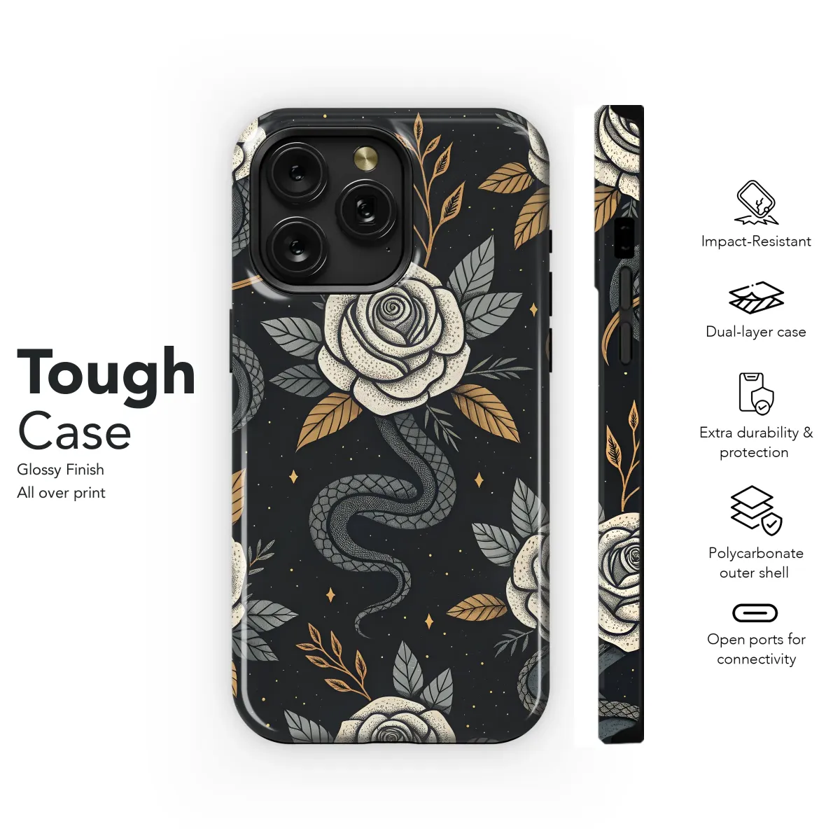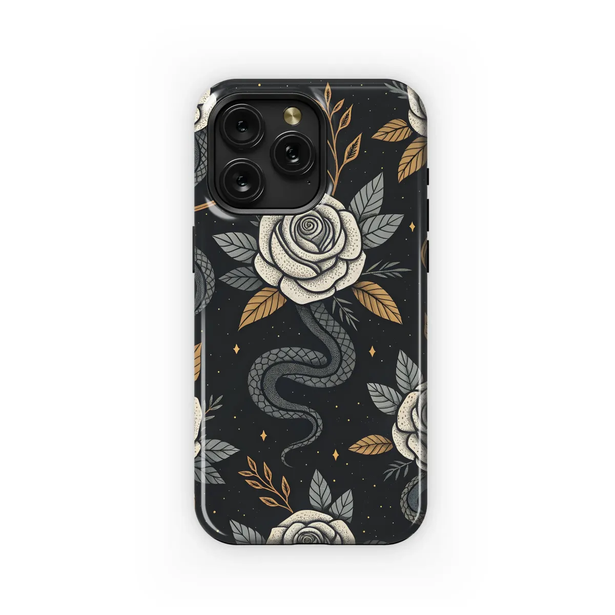 Elevate your style with this captivating design featuring intricately detailed roses and elegant snakes intertwined against a midnight-black backdrop. Gold accents add a touch of luxury, creating a mesmerizing pattern perfect for expressing your unique personality. This meticulously crafted artwork boasts a vintage aesthetic with a modern twist, showcasing a striking contrast between the delicate roses and the sinuous snakes. The detailed stippling and rich color palette combine to produce a high-quality, eye-catching print that's sure to be a conversation starter. This sophisticated design transcends trends, offering timeless appeal and a touch of mystique. Its rich symbolism speaks to both strength and beauty, making it a perfect statement piece for those who appreciate artistry and individuality. Order yours today and transform your accessory into a work of art. This design is printed using vibrant, long-lasting inks for exceptional quality and durability.