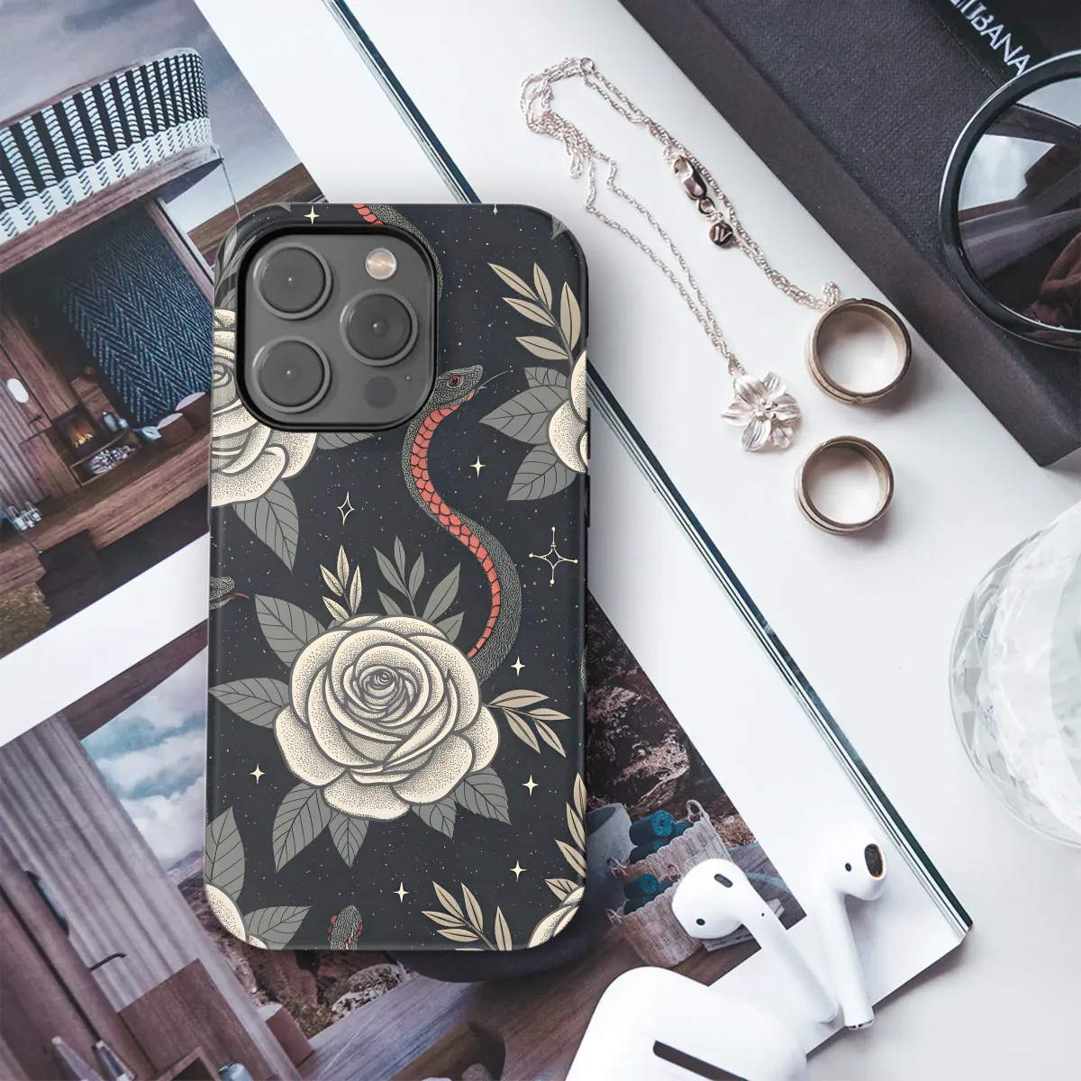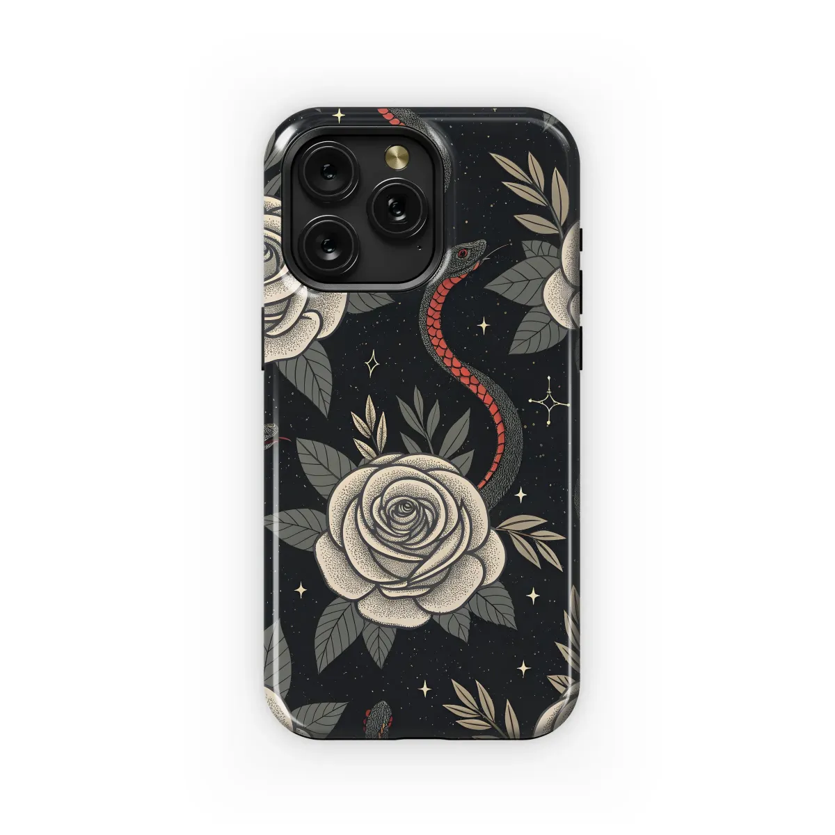 Adorn your device with this captivating design featuring elegant roses and intricate snakes winding through a celestial night sky. The stippled texture adds a touch of vintage charm, while the dark background creates a mysterious and sophisticated aesthetic. This stylish print is perfect for those who appreciate bold patterns and a touch of the mystical. The detailed botanical illustrations and serpentine motifs are beautifully balanced, making this a unique and eye-catching accessory. This high-quality print is vibrant and long-lasting, ensuring your device looks stunning for years to come. Embrace your individuality and express your unique style with this captivating artwork, a perfect blend of floral grace and mysterious allure. This enchanting design is sure to turn heads and spark conversations. It's a perfect gift for yourself or someone who appreciates art and unique fashion statements. Available in various sizes to perfectly fit your device. Get yours today and elevate your everyday carry.