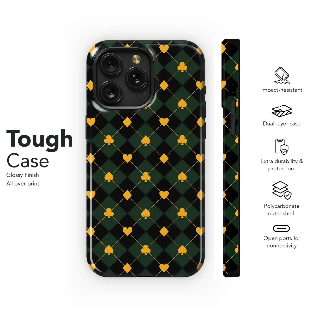 Add a touch of sophisticated style to your everyday carry with this stunning design. Featuring a classic argyle pattern in deep forest green and black, accented by vibrant gold playing card suits, this pattern exudes elegance and a hint of playful intrigue. The bold color contrast and intricate details create a visually captivating piece that's perfect for expressing your unique personality. This high-quality print is vibrant and durable, ensuring your accessory remains a head-turner for years to come. Its timeless design transcends trends, making it a stylish choice for any occasion. Whether you're a seasoned gambler, a lover of classic patterns, or simply seeking an eye-catching accessory, this design offers a unique blend of sophisticated style and subtle playfulness. The crisp, clean lines and rich color palette are sure to elevate your style and make a statement wherever you go. This design is a perfect gift for birthdays, holidays, or any special occasion for the fashion-forward individual who appreciates quality and attention to detail. Get yours today and experience the difference! #argyle #playingcards #gambler #suits #green #black #gold #fashion #accessories #stylish #elegant #unique #highquality #gift.