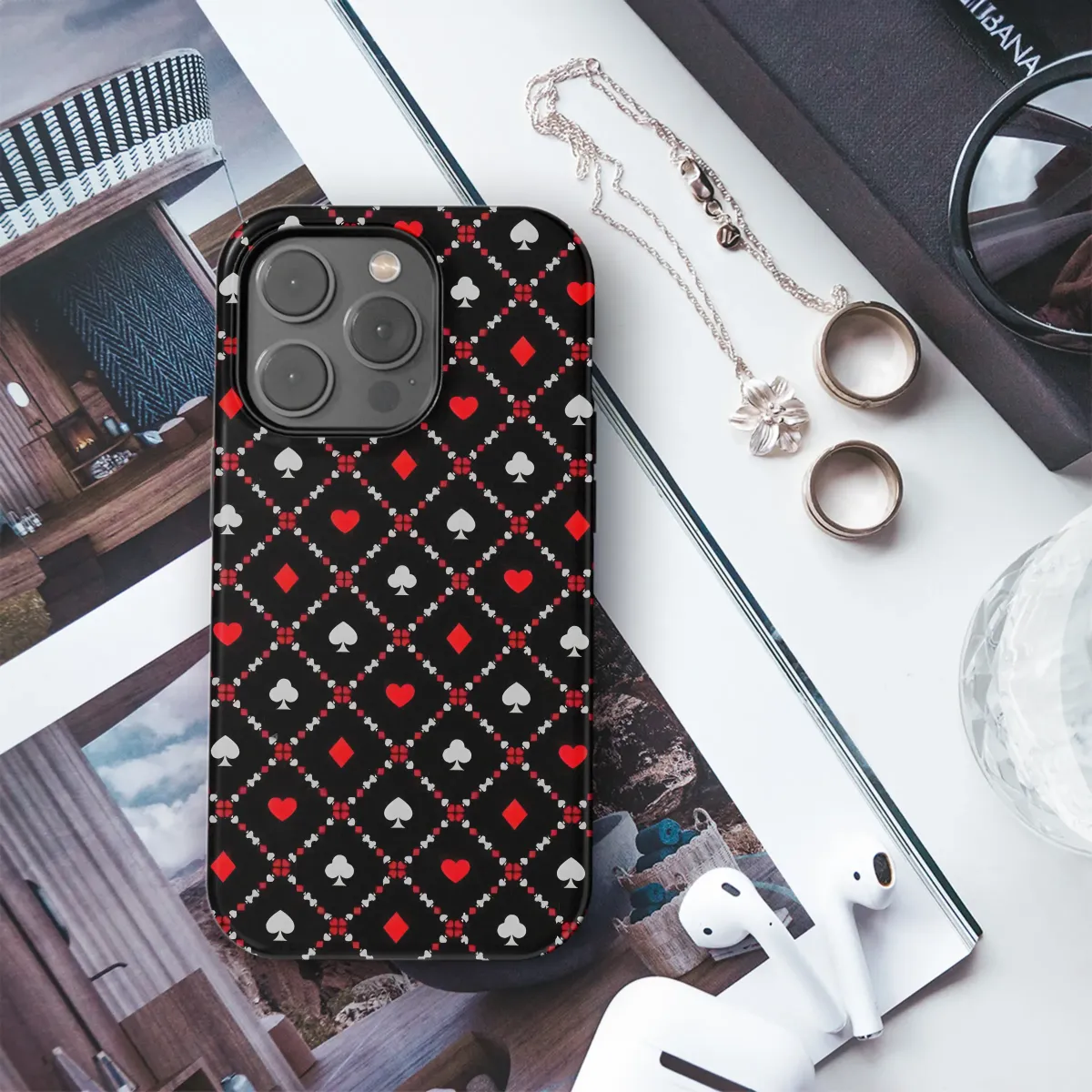 Elevate your style with this sophisticated playing card design. The bold red and gray suits are arranged in a striking diamond pattern against a classic black background, creating a visually captivating and subtly luxurious aesthetic. This timeless design offers a unique blend of elegance and playful charm, perfect for those who appreciate a touch of classic casino style. The intricate detail ensures your accessory will stand out from the crowd, making it a conversation starter wherever you go. This high-quality print is durable and vibrant, ensuring your design remains as bold and beautiful as the day you received it. Add a touch of high-stakes glamour to your everyday life; order yours today and experience the difference! #playingcards #casino #cards #red #black #gray #diamondpattern #luxury #sophisticated #elegant #stylish #accessories #design #print #highquality #unique