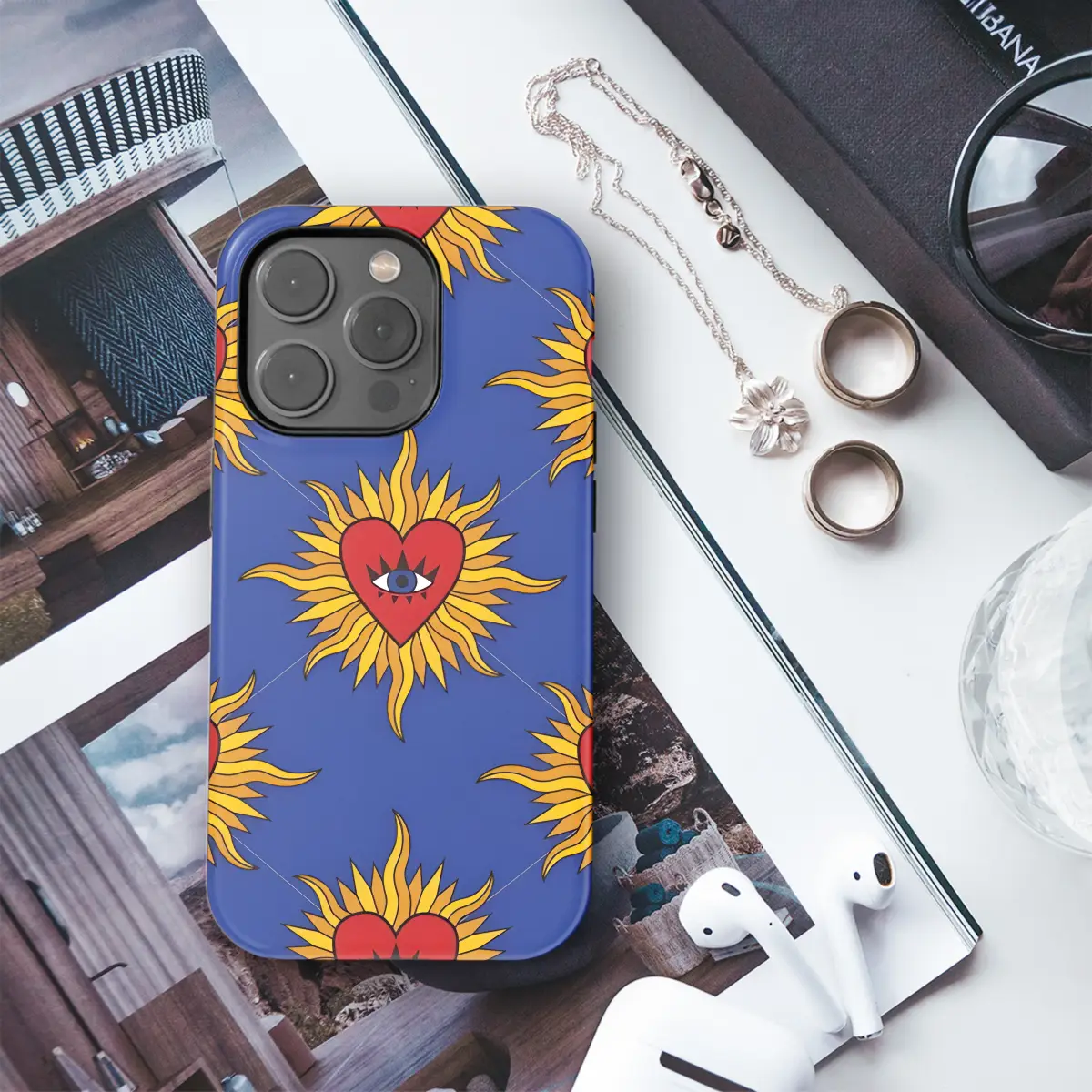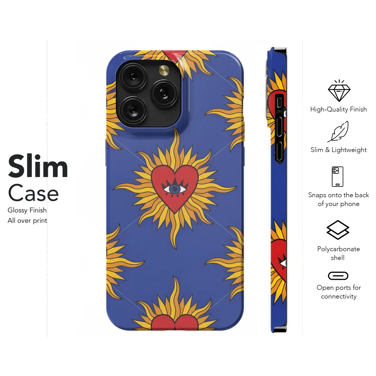 Protect your phone in high style with our enchanting Royal Gothic Pattern Sacred Heart Evil Eye Sun Phone Case. This stunning case features an intricate Gothic pattern, adorned with a sacred heart, evil eye, and sun symbols, giving your device a touch of celestial charm. Its sleek design not only safeguards your phone but also complements your personal style. Available for iPhone, Samsung, and Pixel models, this handcrafted case perfectly fits your device, allowing easy access to all buttons, ports, and features.