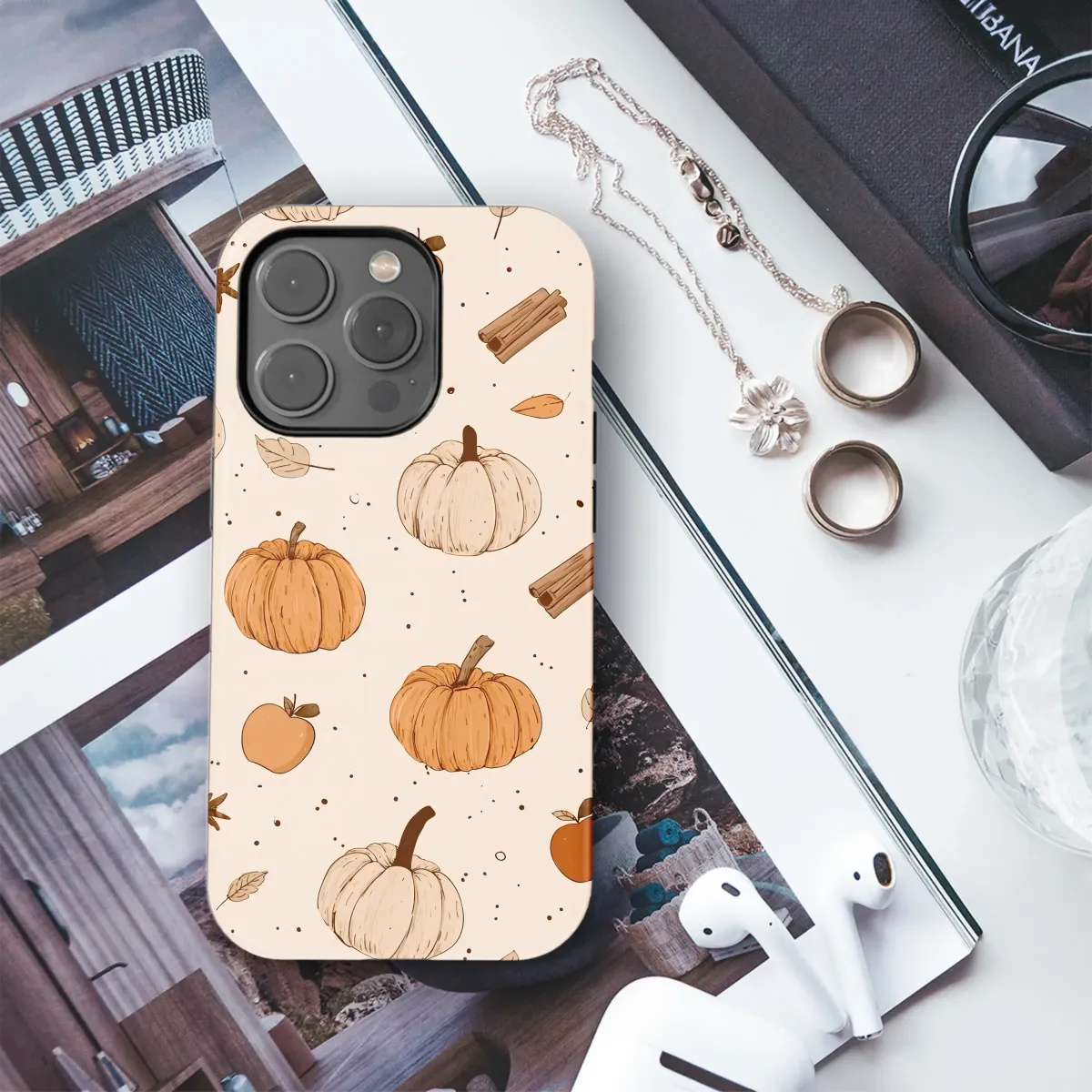 Embrace the heart of autumn with this enchanting design, a warm hug for your favorite accessory. Picture a crisp, golden afternoon, the air filled with the sweet, nostalgic scent of apple picking and pumpkin patches. This beautifully hand-drawn pattern captures that exact feeling, scattering plump orange and cream pumpkins across a soft, speckled backdrop, reminiscent of a cozy baker's parchment. Juicy, ripe apples hint at homemade pies, while fragrant cinnamon sticks and delicate star anise promise warm, spiced lattes and cozy moments by the fire. Each element, from the gently falling leaves to the rustic, illustrated lines, is rendered in a warm, earthy palette of burnt orange, soft cream, and deep brown, creating a visual symphony of the harvest season. This isn't just a pattern; it's an invitation to slow down, sip something warm, and celebrate the simple, beautiful moments of fall. Let this charming cottagecore and fall aesthetic artwork infuse your daily essentials with the cozy, rustic spirit of the season, making every glance a reminder of your favorite time of year. It's the perfect way to carry a piece of Thanksgiving warmth and harvest joy with you, adding a touch of personalized, artistic flair to your everyday.