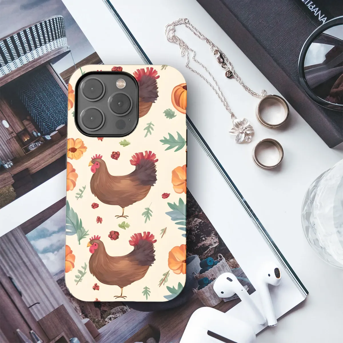 Embrace the charm of the countryside with this delightful design, perfect for adding a touch of rustic elegance to your everyday essentials. This captivating pattern features beautifully illustrated hens amidst a scattering of vibrant orange blossoms, leafy greens, and petite berry accents, all set against a soft, creamy background. The earthy tones and watercolor-inspired textures create a warm and inviting aesthetic, ideal for those who appreciate nature-inspired art. Use this design to bring a touch of farmhouse chic to various creative projects, such as scrapbooking, digital wallpapers, or personalized gifts. It's a fantastic choice for those seeking a unique and stylish pattern that stands out. Consider this eye-catching print for anyone who loves chickens, floral motifs, autumn palettes, or simply wants to add a dose of whimsical flair to their life. Keywords: chicken pattern, floral design, rustic art, country style, autumn colors, watercolor illustration, hen motif, nature inspired, farmhouse decor, digital wallpaper, customizable print.