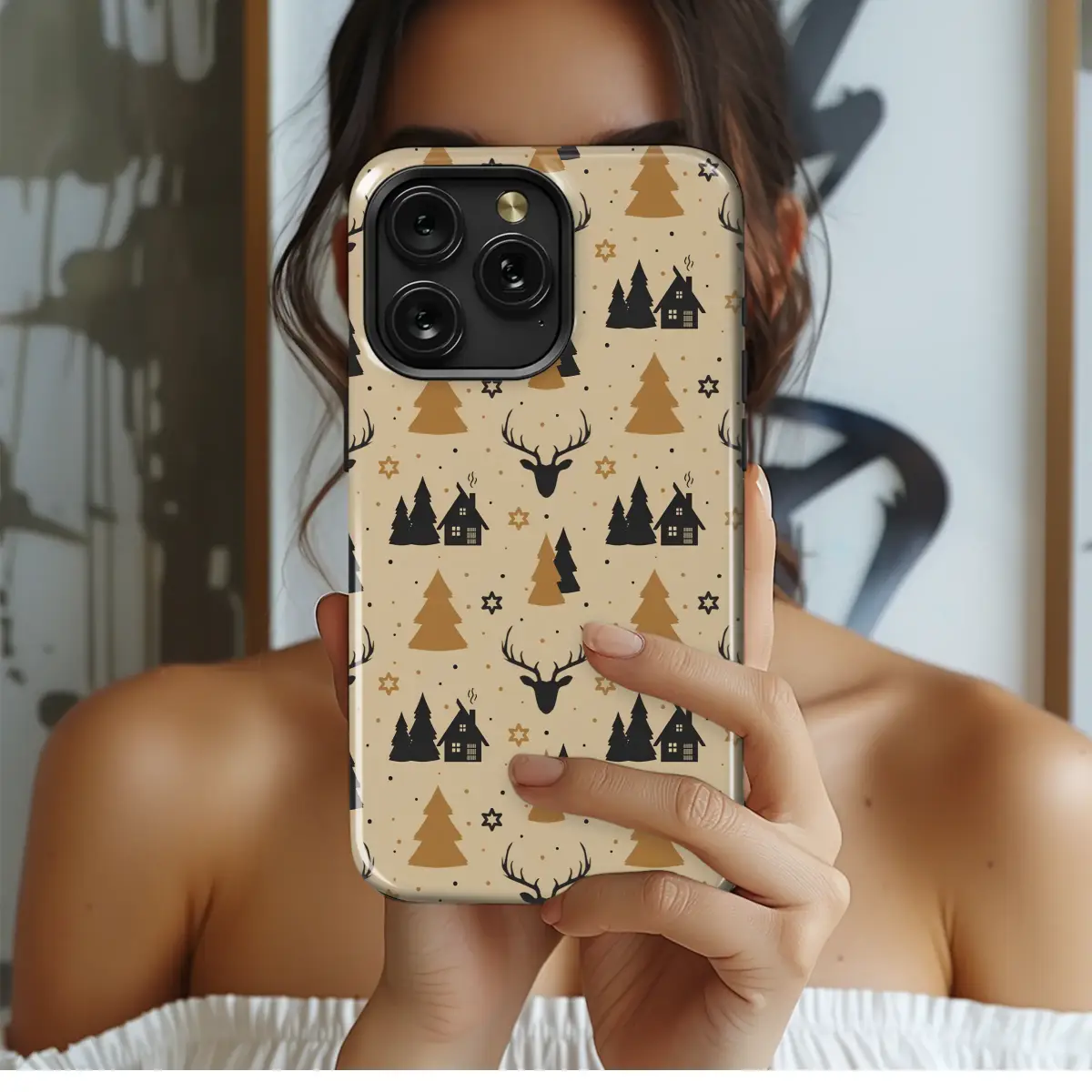 Embrace the cozy spirit of the holidays with this charming rustic winter design. This festive pattern features a minimalist forest scene with striking black reindeer silhouettes, cozy cabins, and elegant gold and black pine trees. Set against a warm beige background with scattered stars and dots, this design captures the serene magic of a quiet Christmas in the woods.