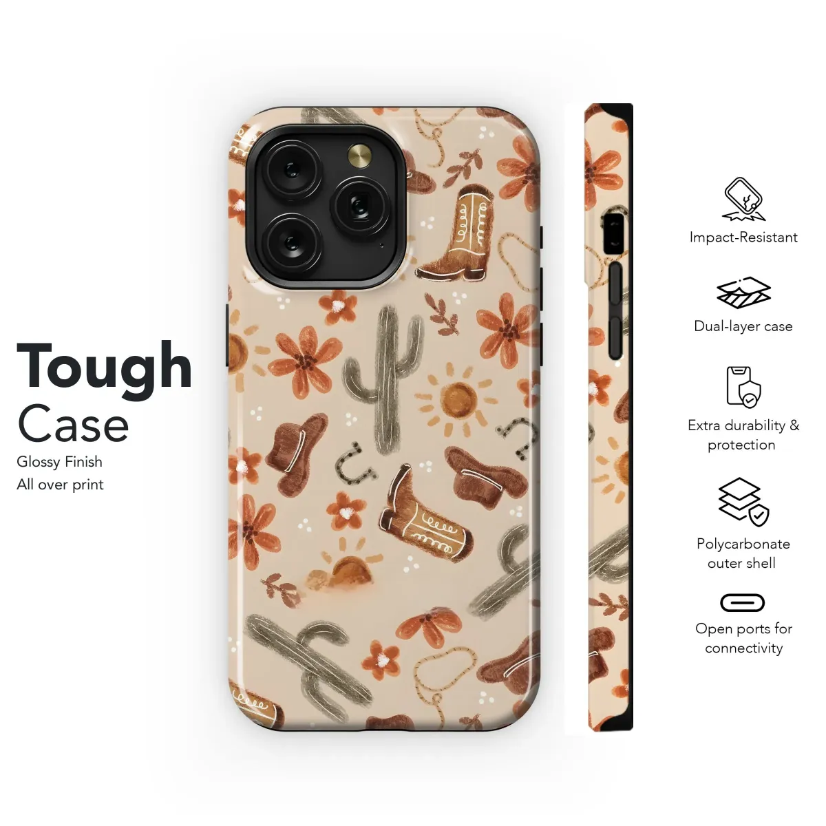 Giddy up and give your favorite device a touch of Western charm with this delightful desert-inspired design! Featuring a playful pattern of cowboy hats, boots, cacti, lucky horseshoes, and bright desert blooms, this design is perfect for anyone who loves a bit of country flair. The warm, earthy tones and hand-drawn style give it a rustic, yet modern appeal. It's a great way to add a unique and stylish touch to your everyday life and show off your love for the Southwest. Whether you're a cowgirl at heart or just appreciate a good Western motif, this design is sure to bring a smile to your face. Ideal for those seeking a Southwestern pattern, cowboy decor, or country western aesthetic. Get yours today and let your inner cowpoke shine! Perfect for gift-giving, too, especially for lovers of rustic design, Western art, and desert themes.