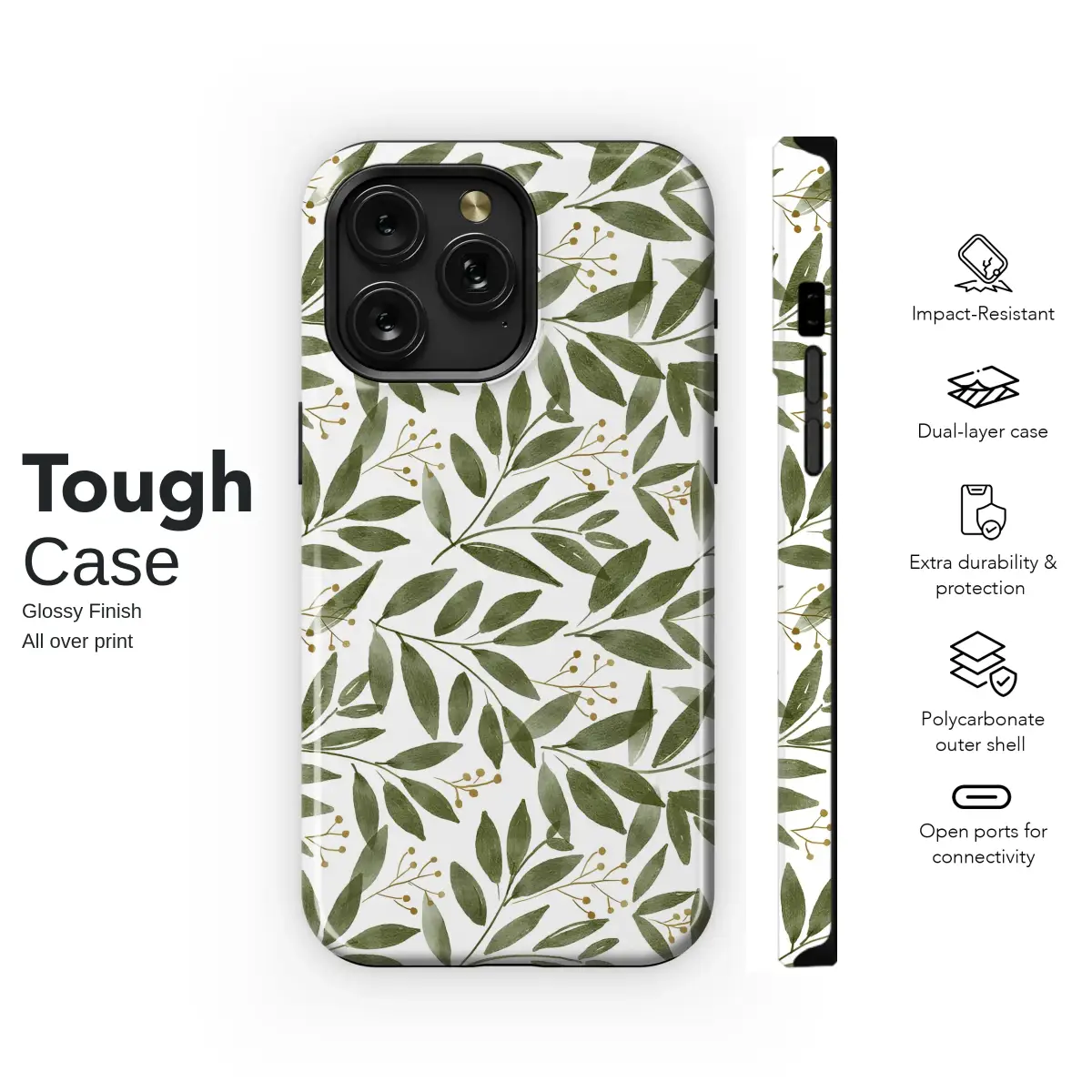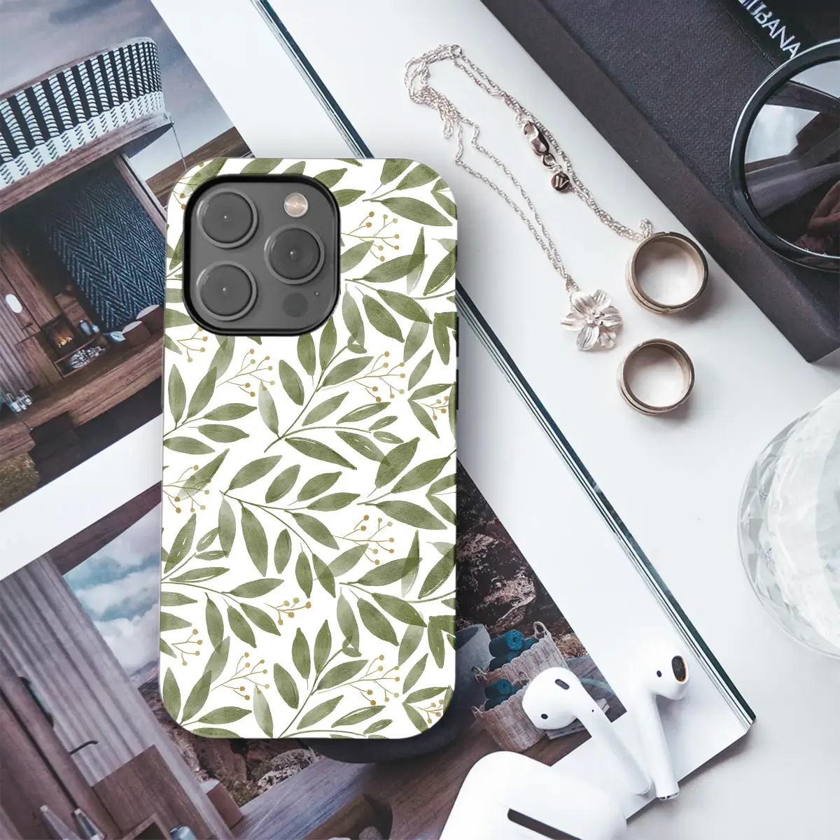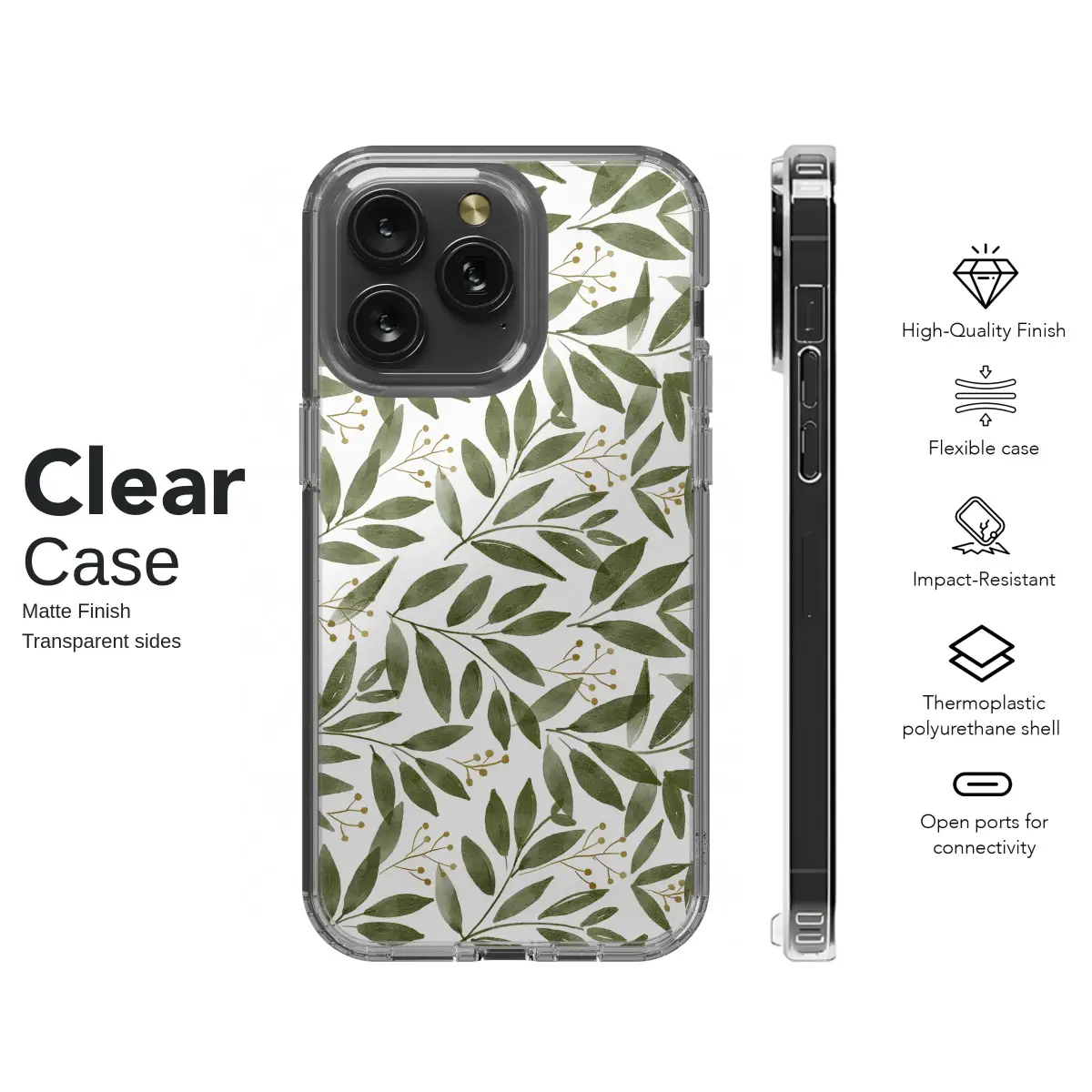 Embrace a touch of nature with this elegant botanical design. It showcases a seamless pattern of watercolor sage green leaves and delicate golden-brown berries against a clean white backdrop. The soft, overlapping foliage creates a calming, earthy aesthetic perfect for anyone who loves minimalist, nature-inspired art.