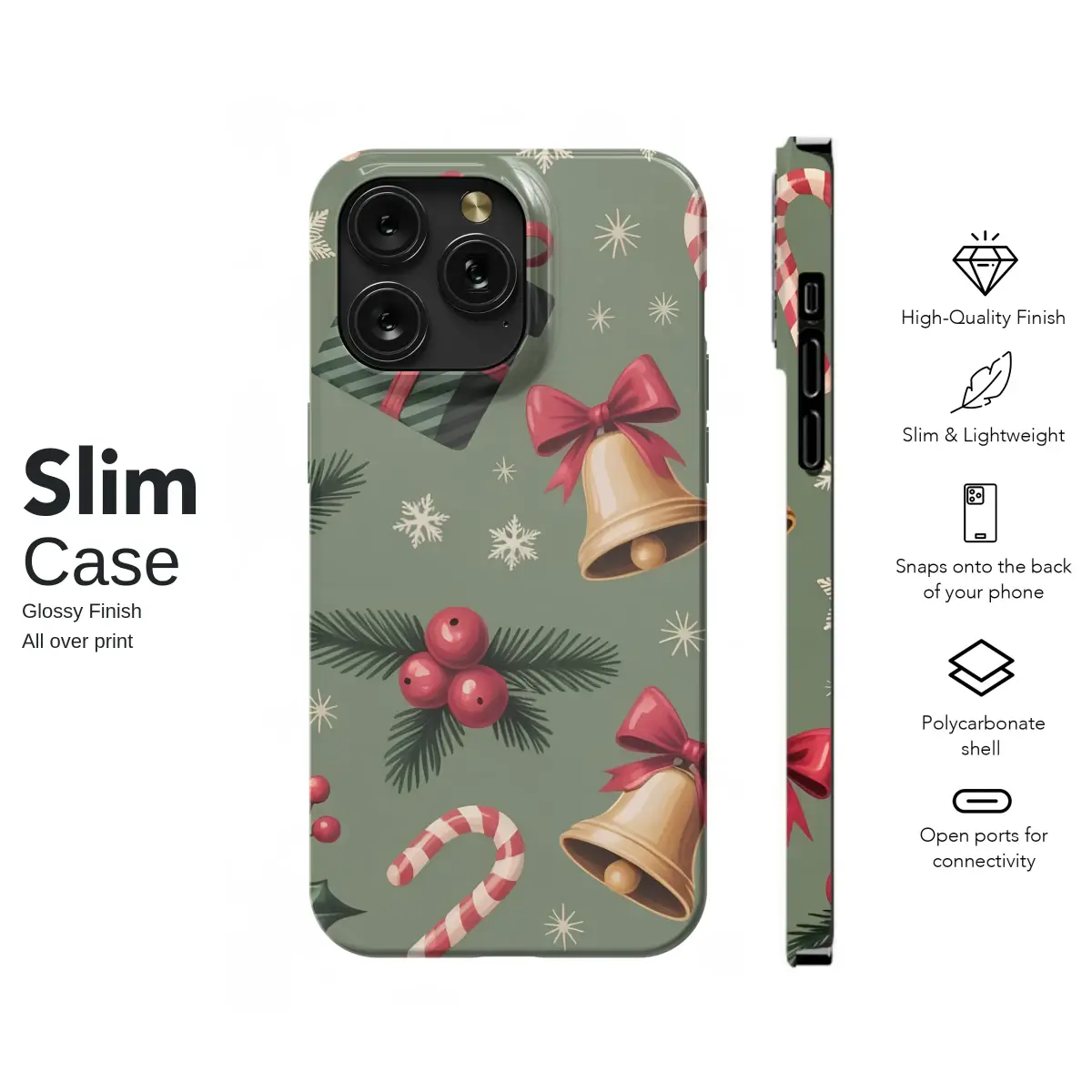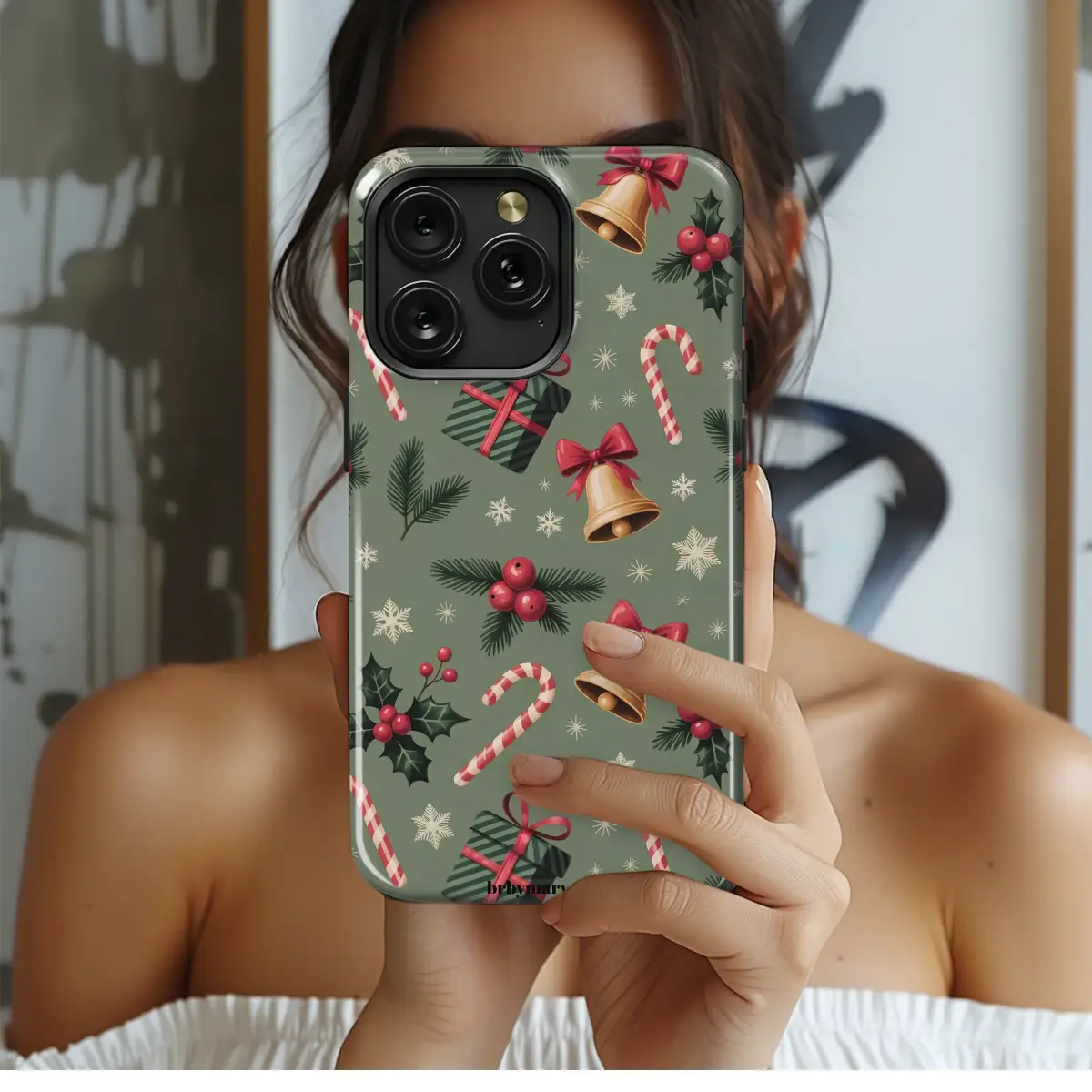 Embrace the holiday spirit with this charming vintage Christmas design. Set against a sophisticated sage green background, this festive pattern features classic holiday motifs including cheerful candy canes, golden jingle bells with bright red bows, sprigs of holly with berries, and delicate snowflakes. The timeless illustration style brings a warm, nostalgic feel to your device, perfect for celebrating the winter season.