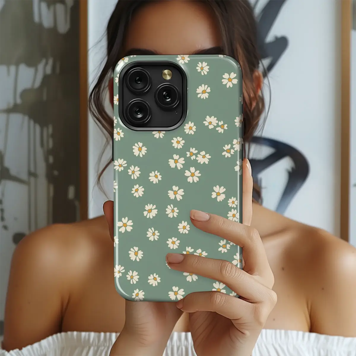 Adorn your accessory with a field of charming, minimalist daisies. This ditsy floral pattern features delicate off-white and yellow flowers scattered across a calming, muted sage green background. The design evokes a sweet, retro-inspired and cottagecore aesthetic, perfect for adding a subtle touch of nature-inspired art to your everyday life.