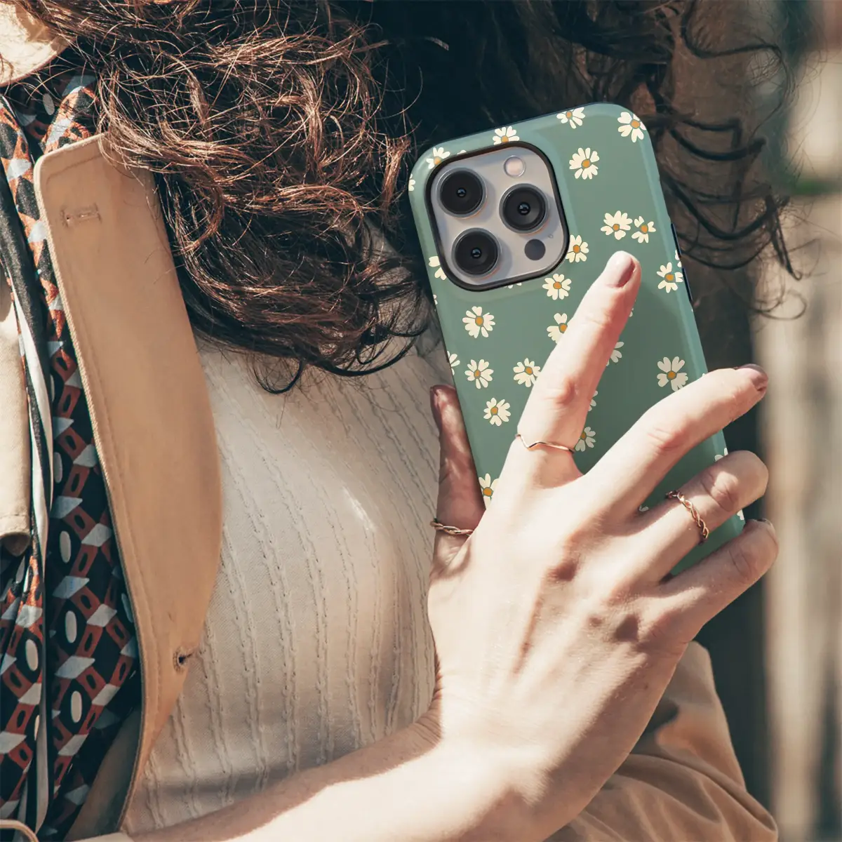 Adorn your accessory with a field of charming, minimalist daisies. This ditsy floral pattern features delicate off-white and yellow flowers scattered across a calming, muted sage green background. The design evokes a sweet, retro-inspired and cottagecore aesthetic, perfect for adding a subtle touch of nature-inspired art to your everyday life.