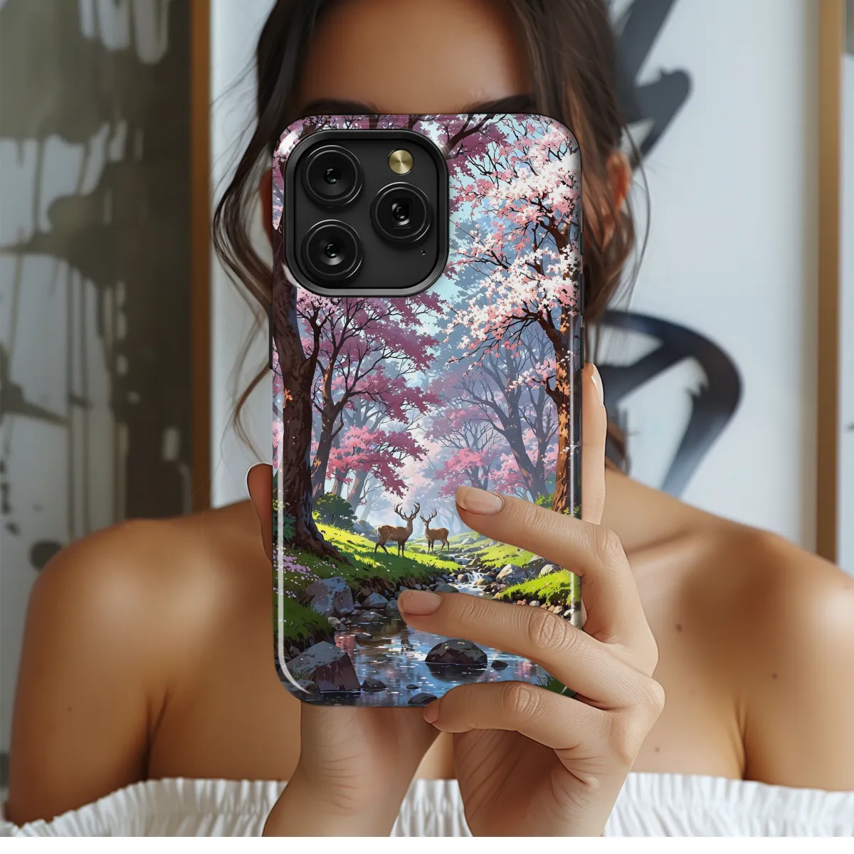 Immerse yourself in the serene beauty of the Japanese landscape with our Sakura Deer Stream phone case. This captivating design showcases a whimsical scene of delicate cherry blossoms fluttering above a tranquil stream, where majestic deer graze peacefully. Crafted from premium materials, our phone case provides both style and protection for your beloved device, ensuring it remains safe from harm while you revel in the wonders of nature.