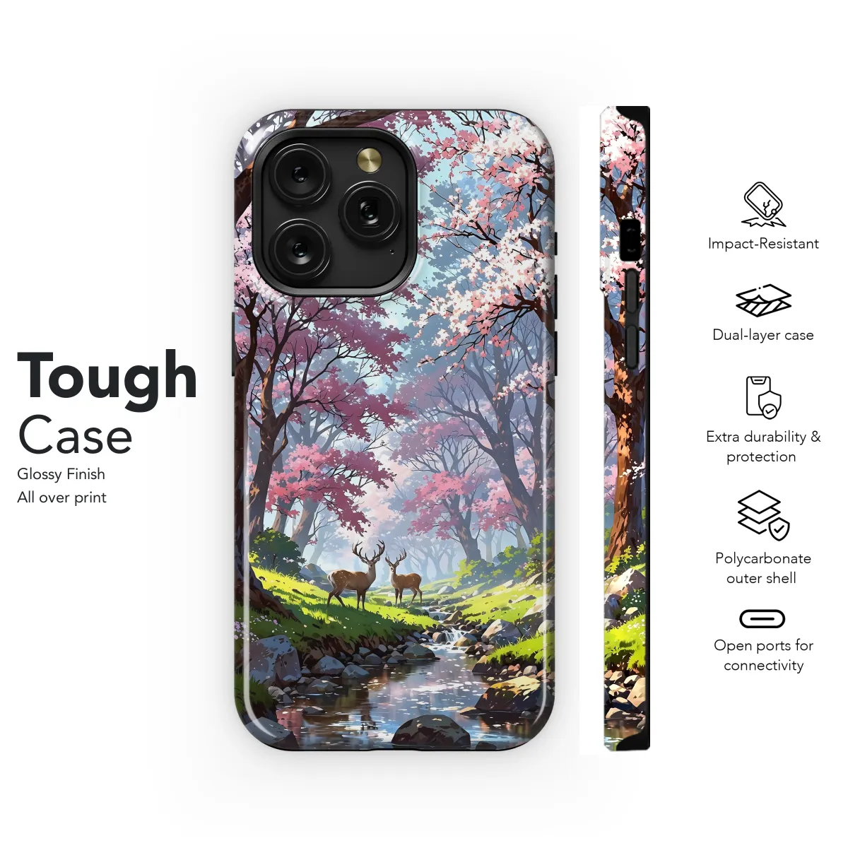 Immerse yourself in the serene beauty of the Japanese landscape with our Sakura Deer Stream phone case. This captivating design showcases a whimsical scene of delicate cherry blossoms fluttering above a tranquil stream, where majestic deer graze peacefully. Crafted from premium materials, our phone case provides both style and protection for your beloved device, ensuring it remains safe from harm while you revel in the wonders of nature.