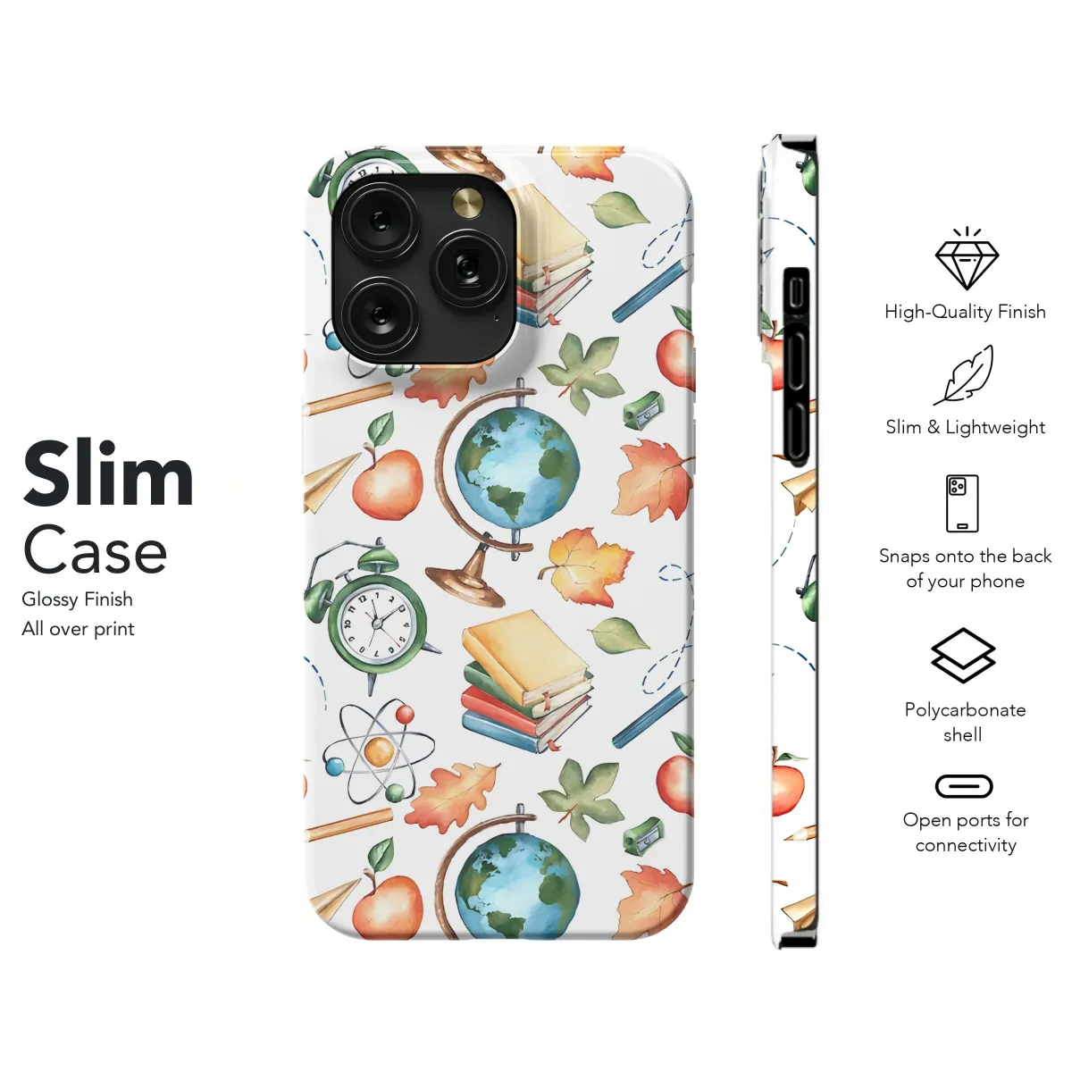 Adorn your device with this charming "Back to School" themed design! Featuring a delightful watercolor pattern of classic school icons, including stacked books, apples, globes, vintage alarm clocks, pencils, and colorful autumn leaves, this artwork evokes a sense of nostalgia and academic charm. The intricate details and vibrant colors of the watercolor illustrations bring a touch of artistry to your everyday tech. Perfect for students, teachers, or anyone who appreciates a touch of scholastic flair, this design is sure to make a statement. Celebrate learning and education with this unique and eye-catching print. Great gift idea for graduation, teacher appreciation or back to school season! Add a touch of academic elegance to your tech accessory with this adorable pattern.