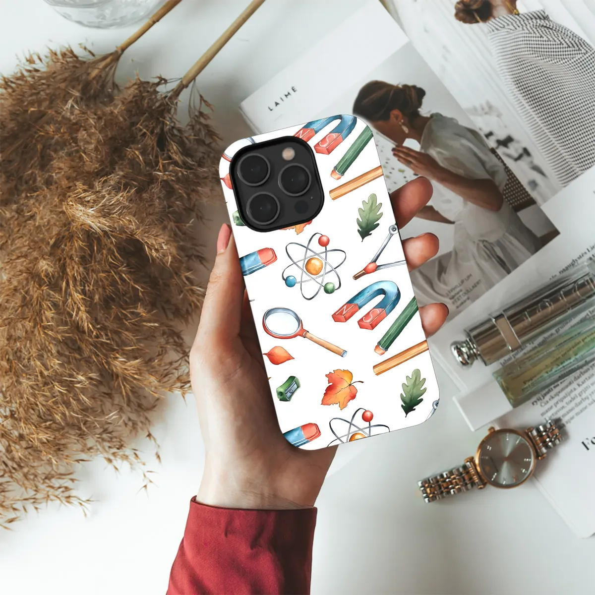 This vibrant watercolor design showcases a delightful array of scholastic tools and autumnal elements, perfect for adding a touch of academic charm to your everyday essentials. Featuring pencils, a compass, a magnifying glass, magnets, erasers, a sharpener, and charming autumn leaves, this pattern evokes a sense of playful learning and the beauty of fall. The whimsical atom illustrations add a scientific flair, making it ideal for students, educators, or anyone with a love for knowledge and the changing seasons. This high-resolution print ensures crisp, vibrant colors and exceptional detail on your chosen product, making it a unique and stylish accessory. The cheerful and engaging design is sure to brighten your day and spark conversations wherever you go. Its versatile nature ensures it complements various styles and personalities, making it a thoughtful gift or a perfect treat for yourself. This design is a captivating blend of science, autumnal beauty, and playful stationery, resulting in a truly unique and memorable piece.