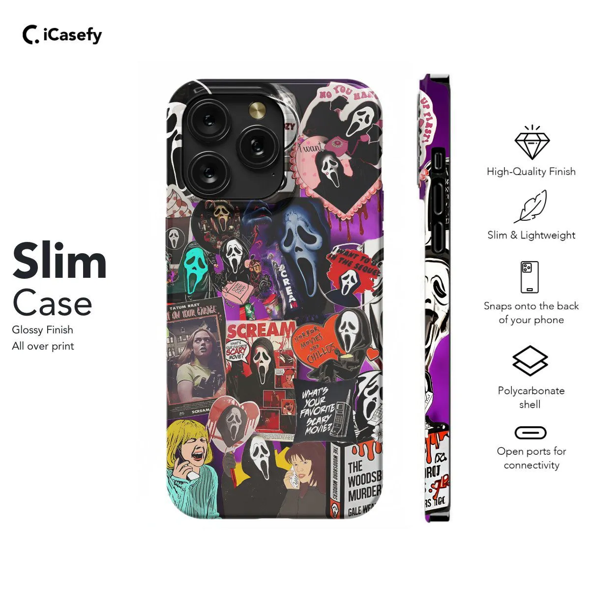 Immerse yourself in the eerie world of horror with a captivating phone case featuring a collage of scream mask imagery. Inspired by the iconic horror symbol, this accessory evokes a sense of mystery and suspense. Carry a touch of cinematic thrill with you wherever you go, letting your device become a statement of bold and chilling style with this haunting collage case.
