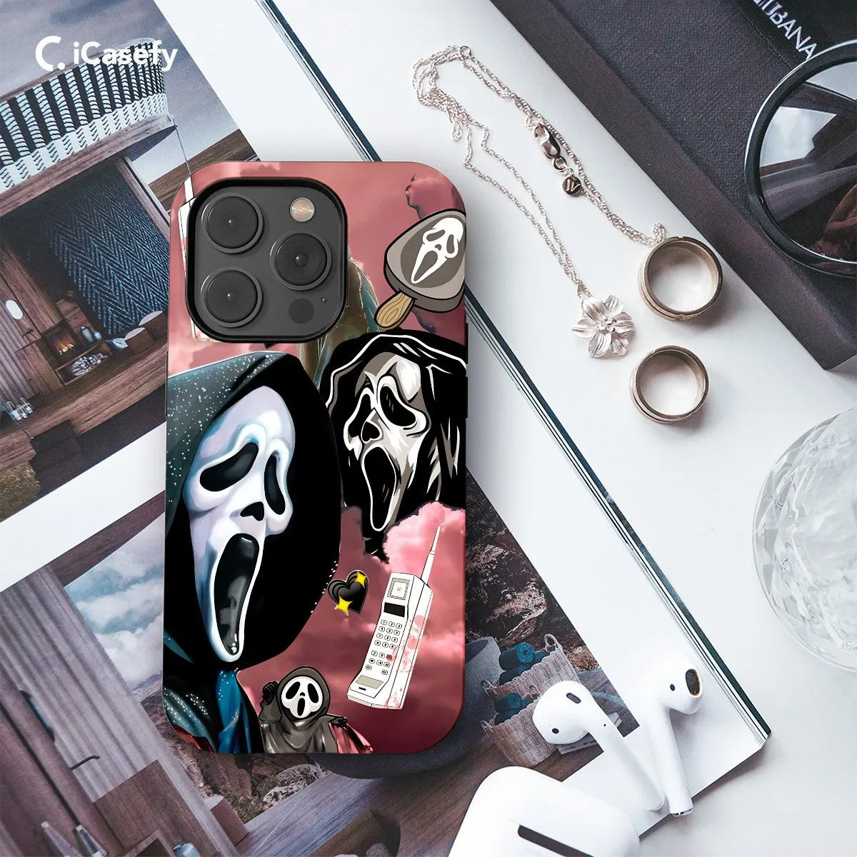 Step into the eerie world of horror with a chilling scream mask collage phone case. This accessory features a haunting compilation of scream mask imagery, evoking suspense and mystery. Carry a touch of cinematic thrill with you wherever you go, letting your device become a statement of bold and chilling style with this haunting collage case.