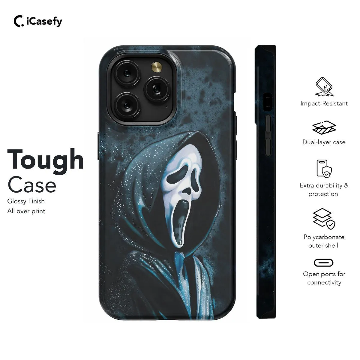 Capture the chilling essence of the iconic Scream with our sleek phone case. Featuring the unmistakable mask design, this case adds a touch of horror nostalgia to your device. Crafted for both style and protection, it's perfect for fans of the spine-tingling franchise. Let your phone scream with personality wherever you go.