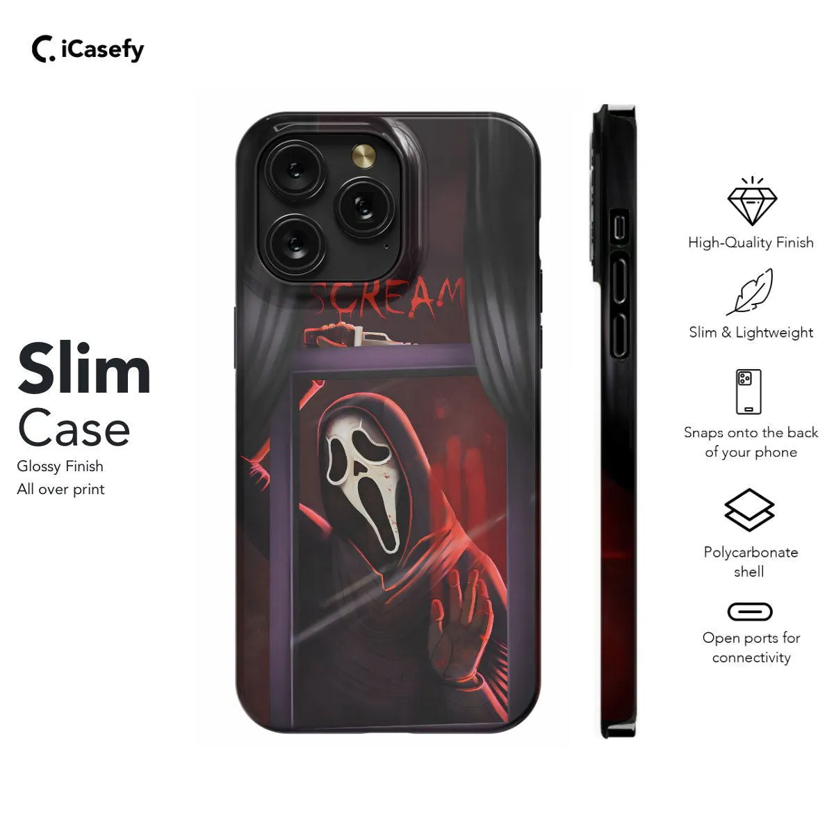 Capture the chilling essence of the iconic Scream with our sleek phone case. Featuring the unmistakable mask design, this case adds a touch of horror nostalgia to your device. Crafted for both style and protection, it's perfect for fans of the spine-tingling franchise. Let your phone scream with personality wherever you go.
