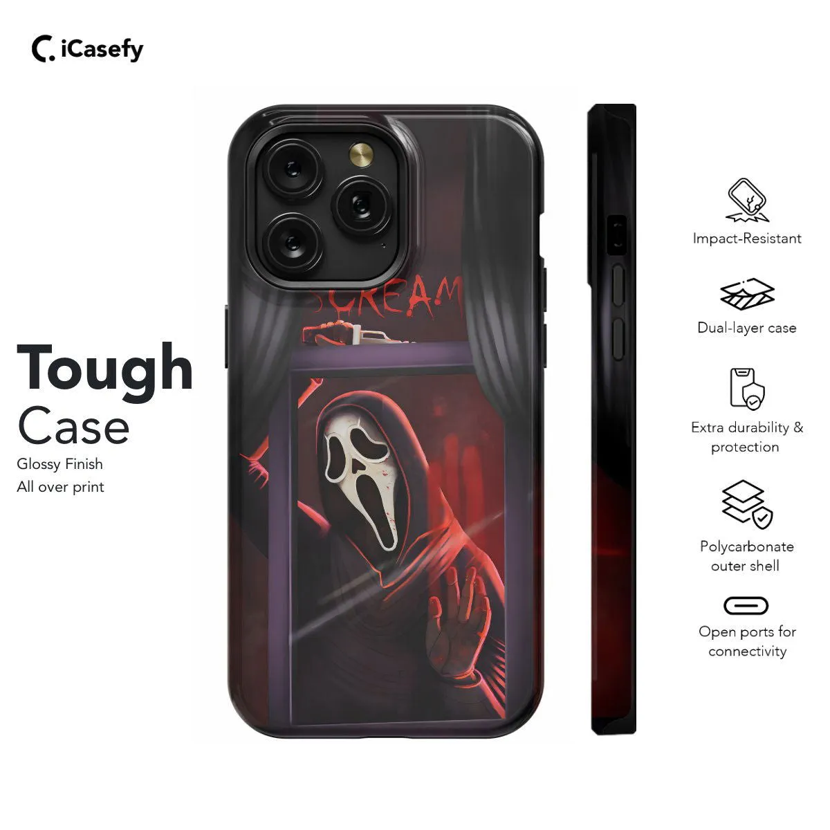 Capture the chilling essence of the iconic Scream with our sleek phone case. Featuring the unmistakable mask design, this case adds a touch of horror nostalgia to your device. Crafted for both style and protection, it's perfect for fans of the spine-tingling franchise. Let your phone scream with personality wherever you go.