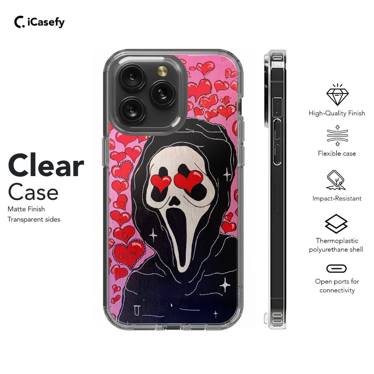 Merge the haunting allure of the Scream mask with the concept of love with this intriguing phone case. Featuring the iconic Scream mask juxtaposed with the word "Love," this accessory creates a captivating contrast between horror and affection. Carry a touch of enigmatic charm with you wherever you go, letting your device become a symbol of the complexity of human emotions with this unique and thought-provoking case.