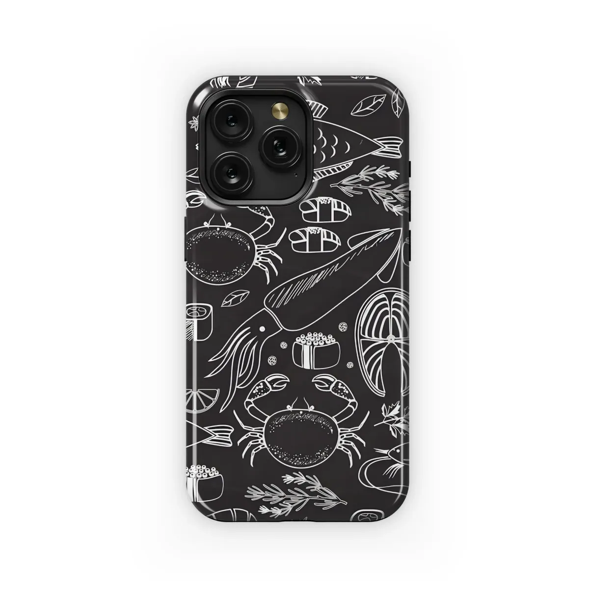 Dive into delicious style with this aquatic culinary art! This monochrome seafood pattern is a feast for the eyes, featuring hand-drawn style illustrations of fish, succulent shrimp, juicy crab, tender squid, and tantalizing sushi rolls, all set against a chalkboard backdrop. Perfect for foodies, sushi lovers, or anyone with a taste for nautical themes, this unique design brings a touch of gastronomic charm to your device. Showcase your love for ocean delicacies with this eye-catching illustration, sure to spark conversations and turn heads. It’s an ideal way to express your personality and add a touch of the sea to your everyday tech. The detailed, vintage-inspired artwork makes this more than just a design; it’s a statement piece for those who appreciate the art of food. Get ready to reel in compliments with this trendy, sea-inspired pattern!