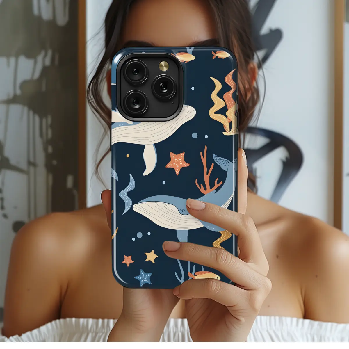 Immerse yourself in the whimsical world of marine life with this enchanting phone case! Featuring a seamless cartoon whale pattern amidst vibrant seaweed, our case will transform your device into a captivating underwater masterpiece. Protect your phone in style with this one-of-a-kind accessory, perfect for ocean lovers and those who appreciate a touch of whimsy in their everyday essentials.