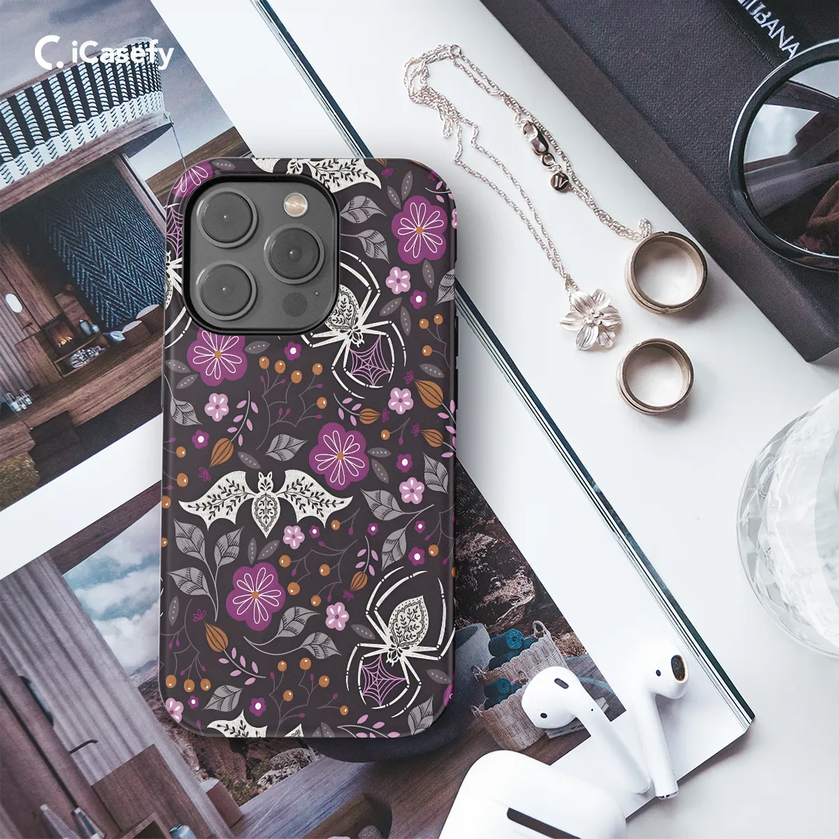 Embrace the enigma with this seamless floral spider web bat phone case. The intricate web design intertwines with delicate flowers, creating an enchanting and mysterious tapestry. The fierce bat silhouette adds a touch of edgy sophistication, making this case both beautiful and protective. Its durable construction ensures your phone stays safe from the clutches of danger, while the precise fit provides effortless access to all functions. Whether you're a fan of gothic chic or simply appreciate the beauty of the macabre, this case will add a touch of intrigue to your daily routine.