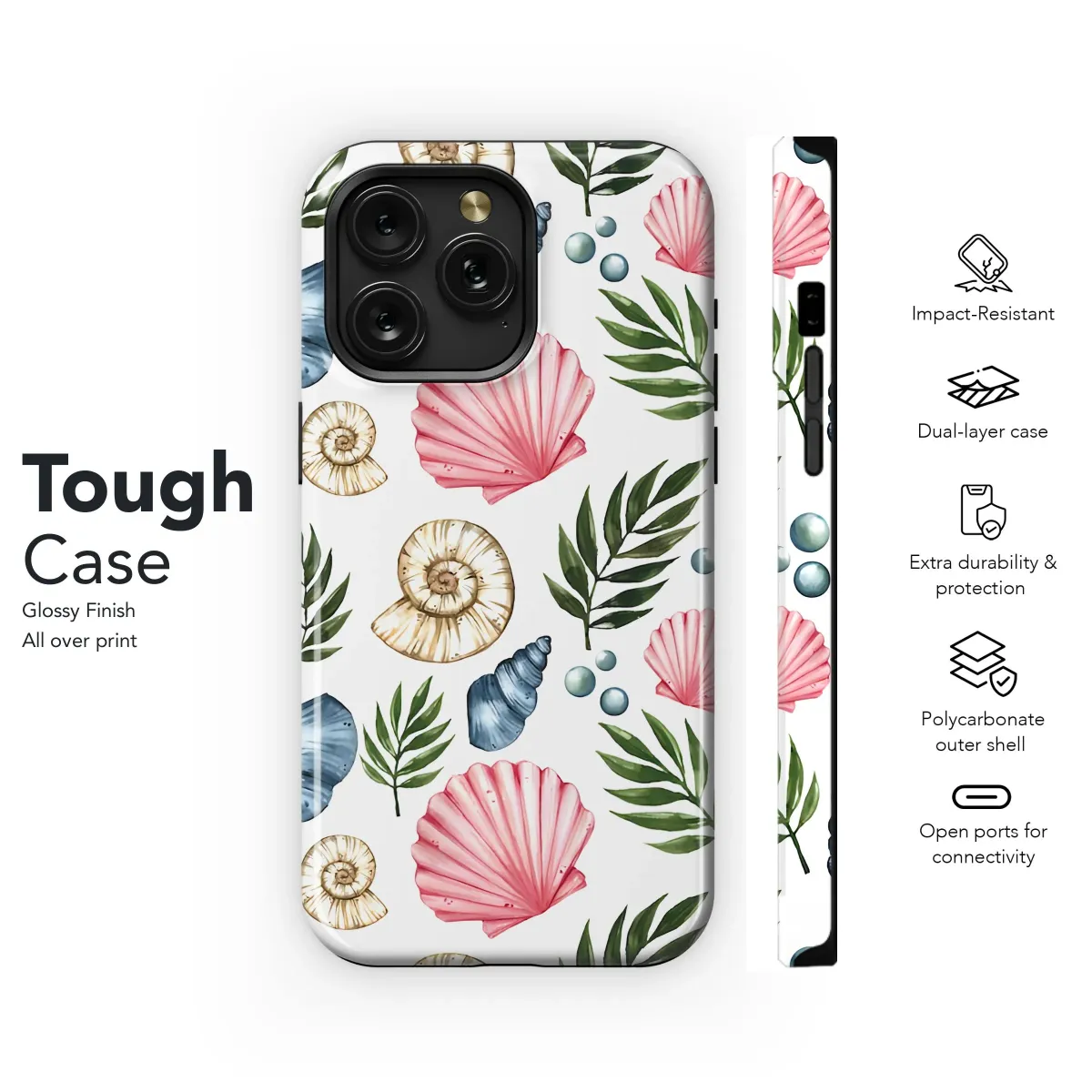 Dive into summer vibes with this captivating coastal pattern! This design features a delightful array of watercolor seashells in soft pinks, ocean blues, and natural tans, complemented by lush tropical foliage and shimmering pearl accents. Evoking a sense of seaside serenity, this vibrant design is perfect for bringing a touch of beachy elegance to your everyday essentials. Use this unique art for your next art project. Ideal for those who love nautical themes, beach decor, summer aesthetics, and ocean-inspired designs. Get your device adorned with this aesthetic and tropical art print! Perfect for adding a touch of seaside charm and a summery feel, this piece makes a stylish statement and a thoughtful gift for ocean enthusiasts. Embrace the beauty of the sea and let your items shine with this exquisite seashell artwork.