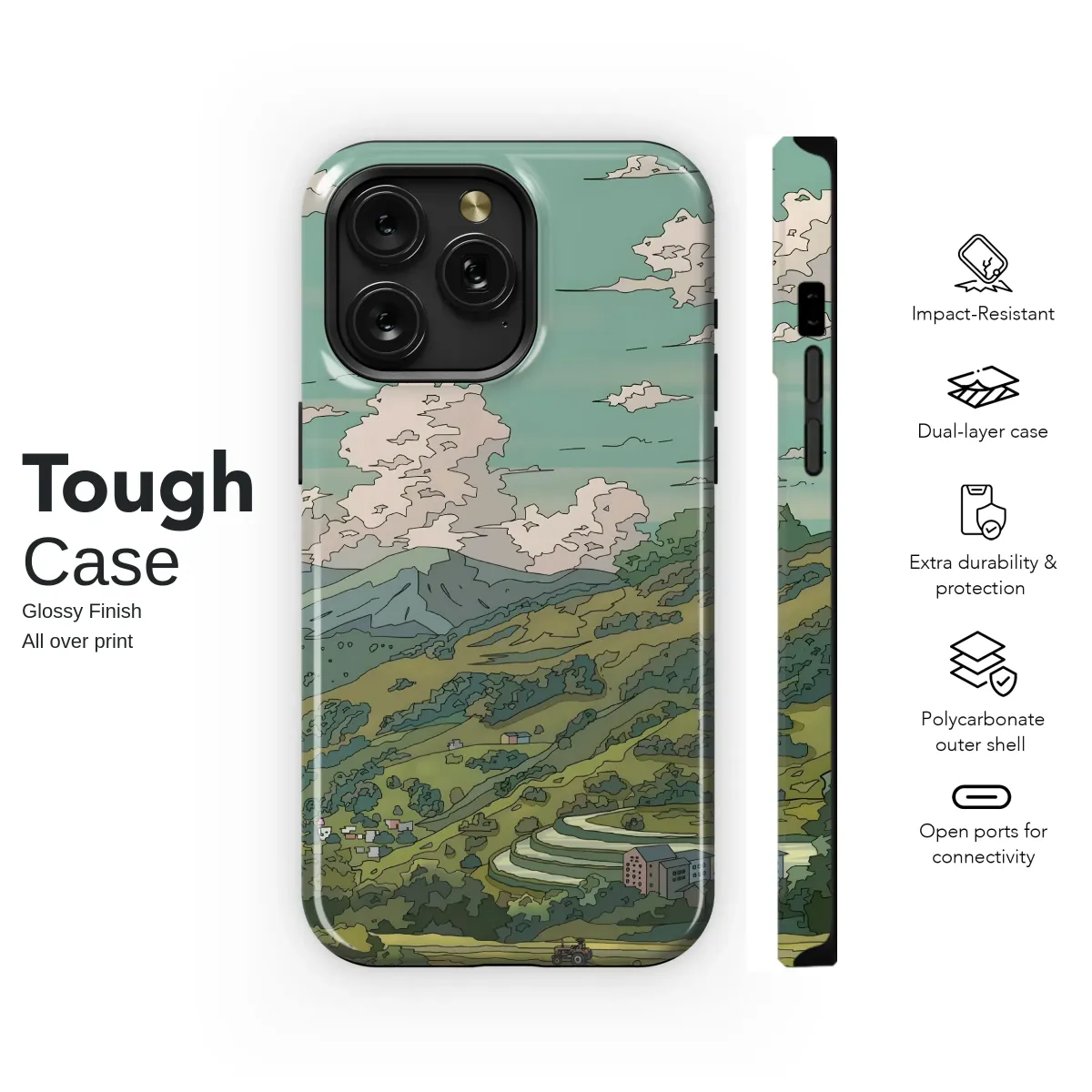 Embrace tranquility with this idyllic landscape design. Featuring a charming village nestled amongst rolling hills and terraced rice paddies under a soft, dreamy sky, this design evokes a sense of peace and serenity. Perfect for those who appreciate natural beauty and understated elegance, the muted color palette and stylized artwork create a sophisticated and calming aesthetic. This unique illustration is digitally printed using high-quality inks for vibrant, long-lasting color and detail. Its lightweight construction ensures easy application and a sleek, slim profile. Showcase your individual style and add a touch of artistic charm to your everyday essentials. This beautiful artwork is a subtle statement piece that will turn heads without being overly loud. Upgrade your personal style with this unique and artistic accessory, making a beautiful statement that reflects your love for nature and thoughtful design. The image is printed directly onto the item, ensuring a clear and vibrant image, resistant to scratches and fading. Express your individuality and bring a piece of artistry into your daily life. This stunning design is a conversation starter and a testament to your refined taste.