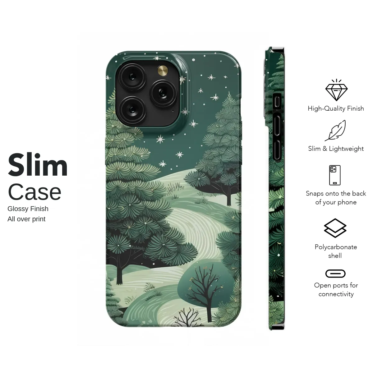 Wander into a tranquil forest under a canopy of twinkling stars with this enchanting design. Imagine the crisp, silent air of a deep winter's night, where a winding path of fresh snow invites you on a peaceful journey through rolling, moonlit hills. Majestic evergreen and pine trees, rendered in rich shades of emerald and forest green, stand as silent guardians against a vast, star-dusted sky. Each stylized star and delicate snowflake captures the serene magic of the season, creating a moment of pure tranquility. This beautiful linocut-inspired artwork evokes the cozy feeling of the holiday season and the quiet solitude of nature, blending a rustic forestcore aesthetic with a touch of whimsical wonder. It's the perfect daily escape for the nature lover, the stargazer, and anyone who finds solace in the untamed beauty of a starlit wilderness. Let this miniature masterpiece transform your essential accessory into a pocket-sized piece of art, a unique statement of your love for the great outdoors. It's a thoughtful gift for her, for him, or for anyone who cherishes the calm and natural elegance of the winter season. Carry this enchanting scene with you and let its peaceful charm inspire your day.